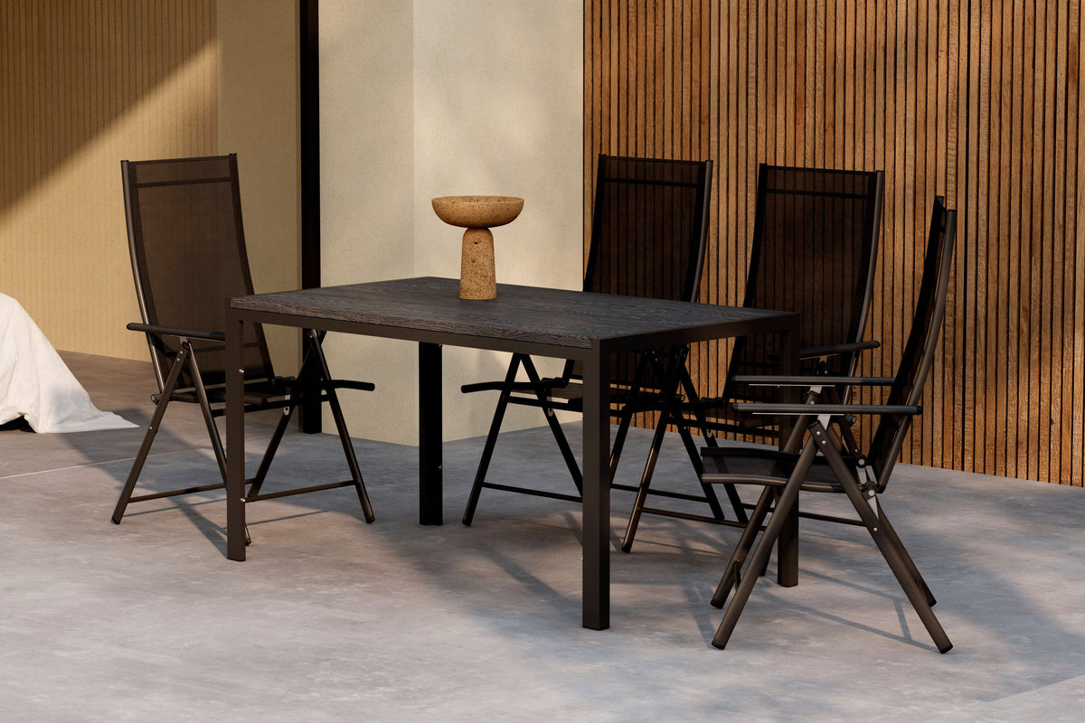 Skab en stilfuld og funktionel spiseplads udendørs med Mirko spisebordssæt, bestående af det elegante Mirko spisebord og Levanzo spisebordsstole. Kombinationen af sort aluminium, krydsfiner og textilene giver en moderne og sofistikeret følelse, perfekt til altanen, terrassen eller haven.