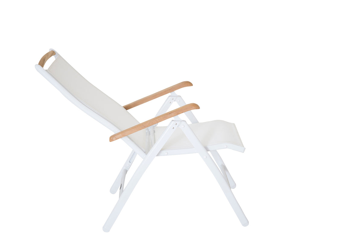 Skab en moderne glans på terrassen med en stol fra serien Panama. En lækker hvid, foldbar spisebordsstol tilpasset til udendørs brug. Med smagfulde armlæn i teak får stolen et pompøst udtryk, hvilket falder mange i smag. Stolen fungerer lige så godt til moderne som klassiske spiseborde. Nyd mange dejlige sommerdage sammen!