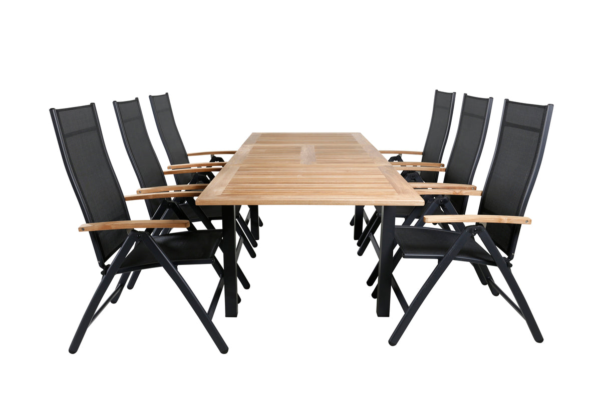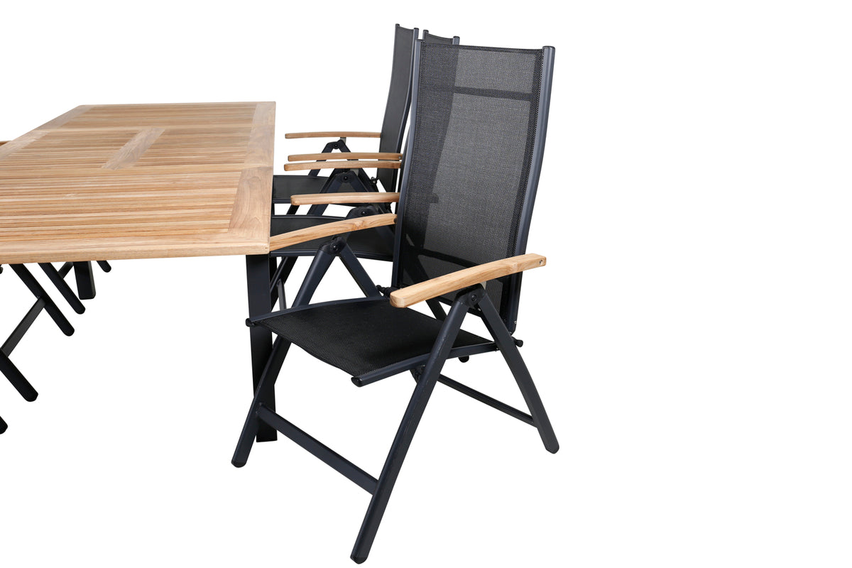 En lækkert matchende spisegruppe i serien Panama, der har plads til alle nære og kære! Her kombineres et dekorativt og forlængeligt spisebord i træ med klapstole i moderne design. Juster ryglænet for optimal komfort og forlæng måltiderne i sommer!