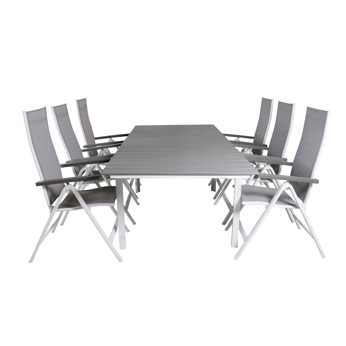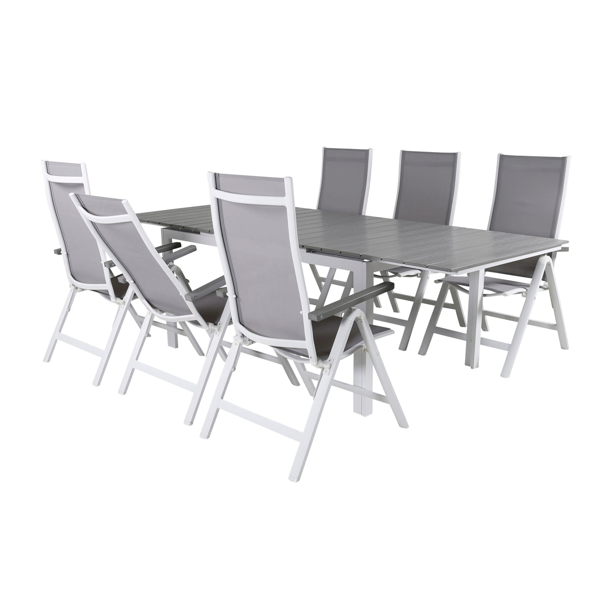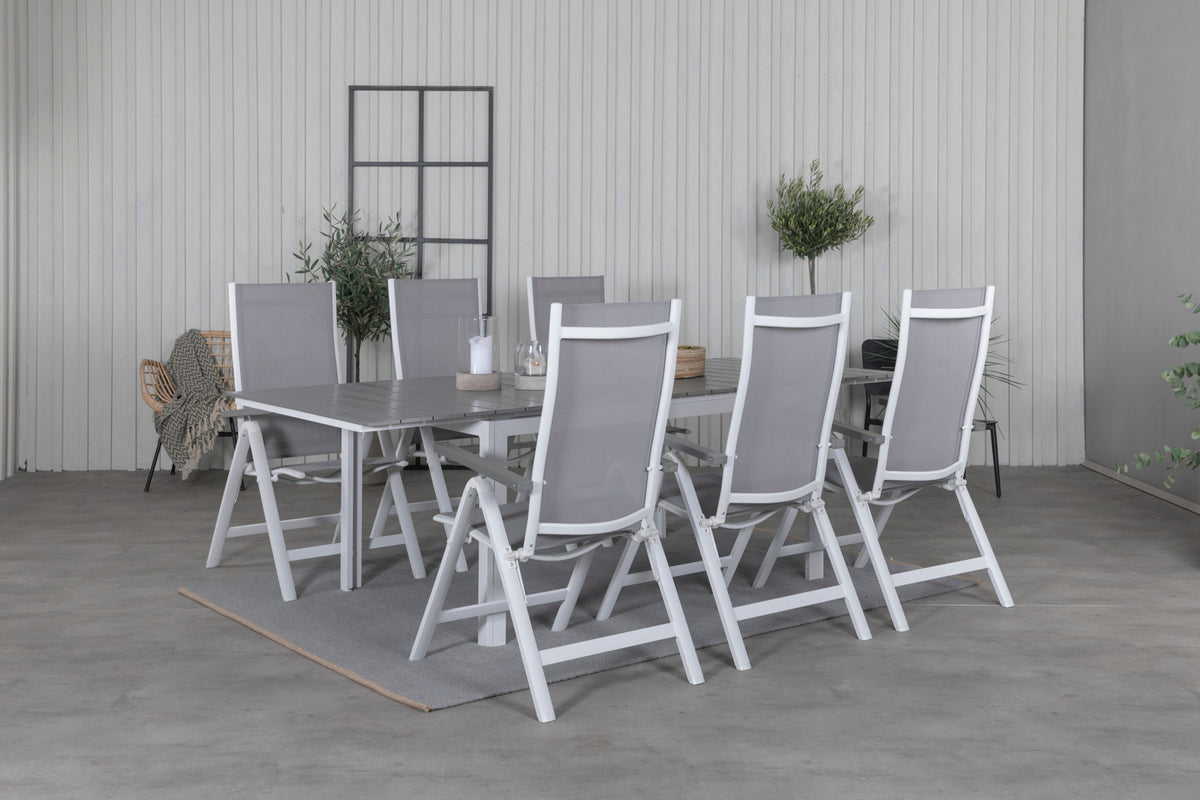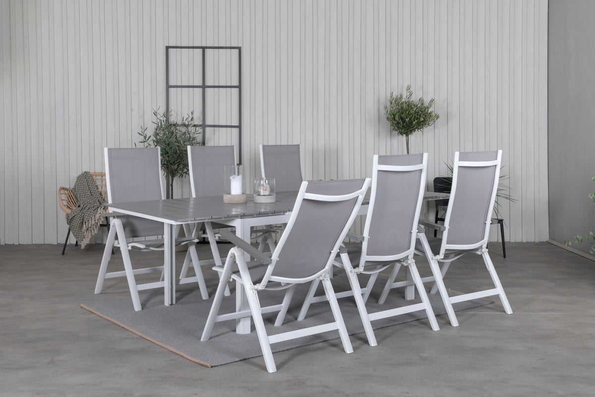 En moderne spisegruppe i grå kulør som rummer plads til alle nære og kære! I de fældbare spisestole Albany sidder du og dine gæster behageligt i flere timer. Her i lækker kombination med det forlængelsesbare spisebord Levels. Lad din terrasse prydes af den her iøjnefaldende spisegruppe og nyd sene sommeraftener!