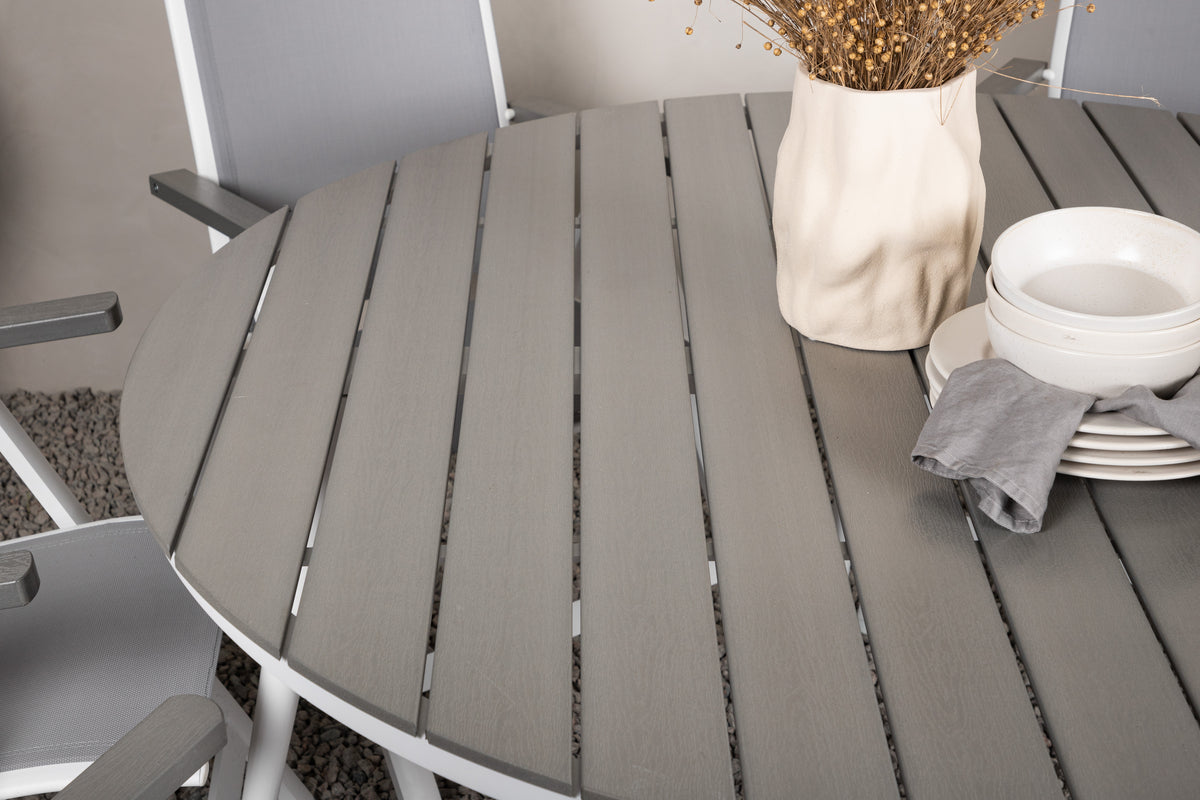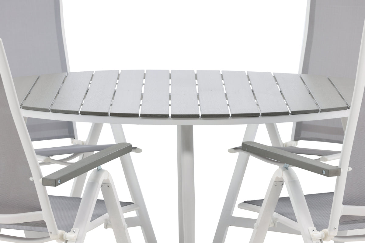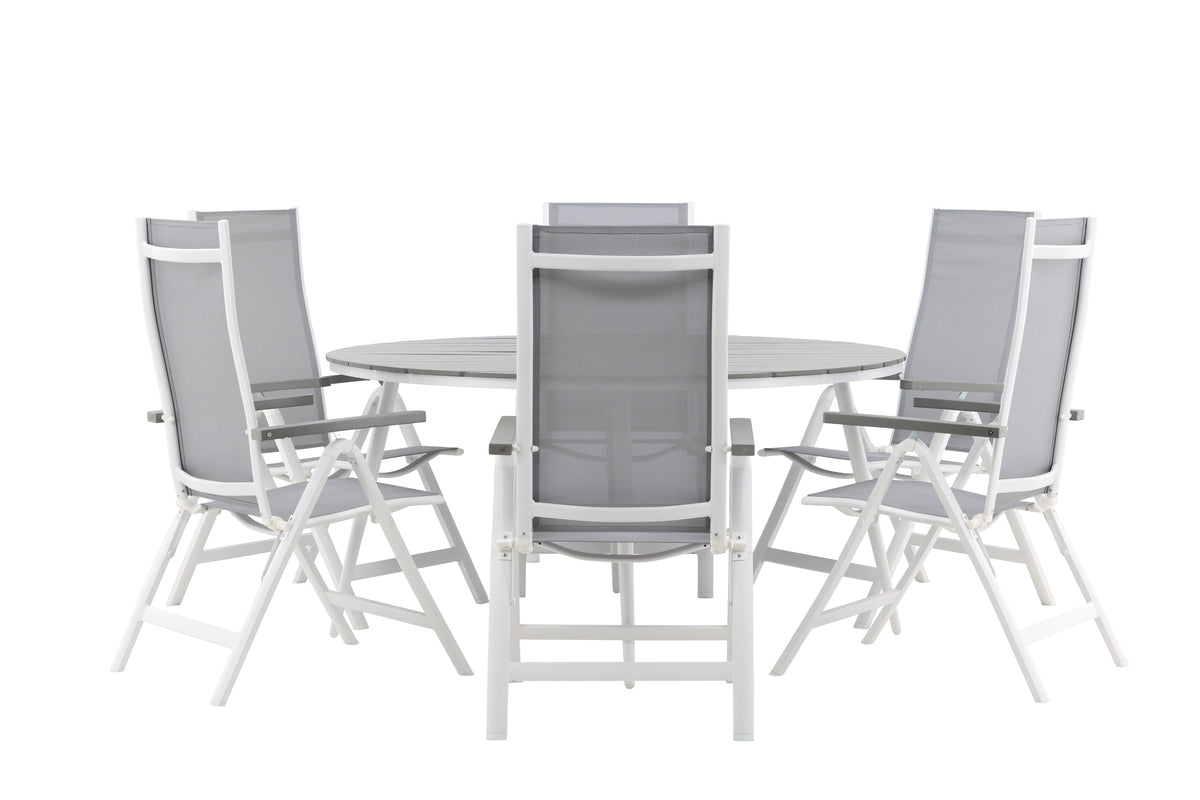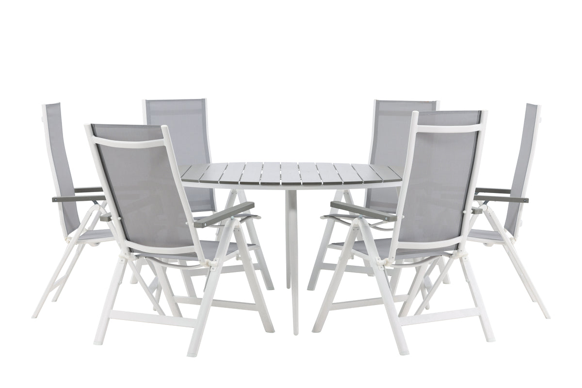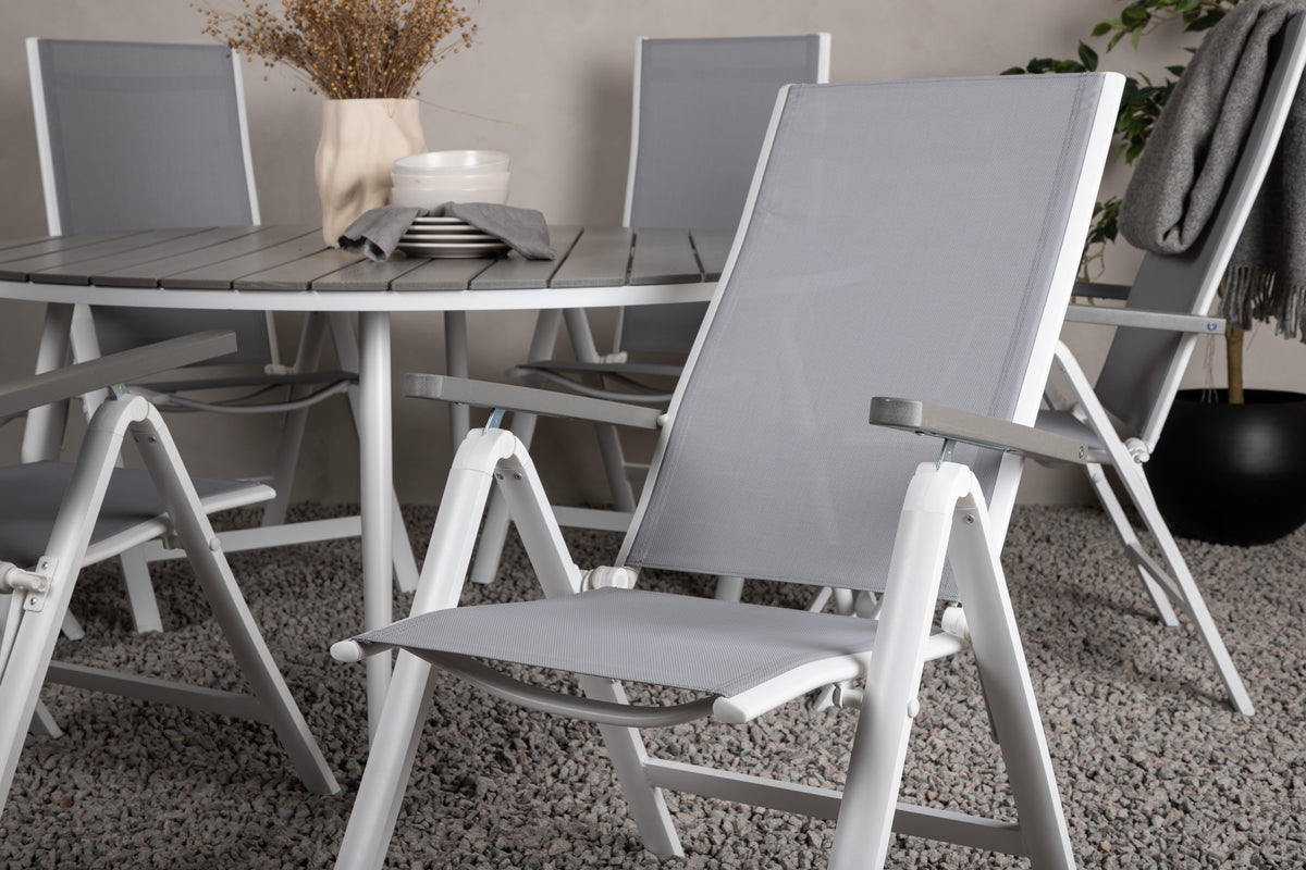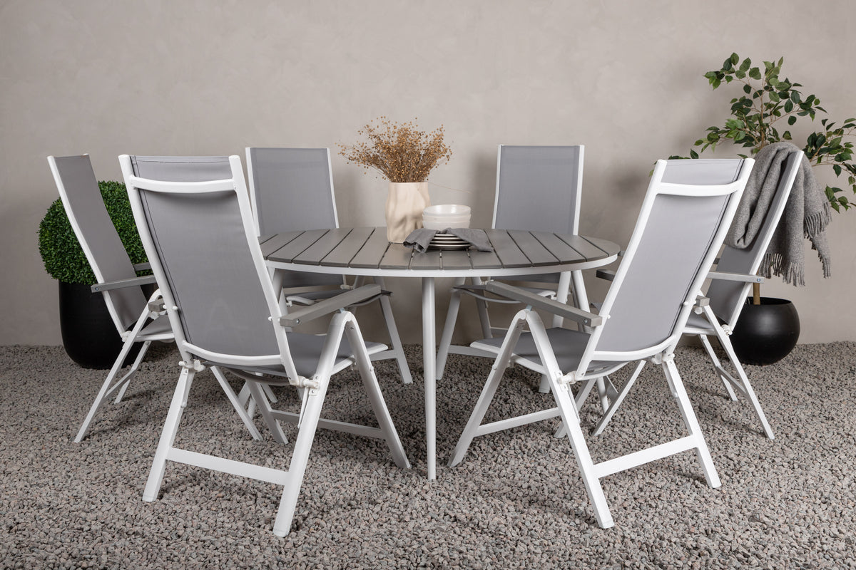 En lækkert matchende spisegruppe i behagelige farver - perfekt til sommerens alle udendørs måltider! Spisebord Break har en rund bordplade i grå aintwood og et klassisk understel i hvid aluminium. Her sammen med 6 stk. spisebordsstole fra serien Albany. Stolen er en grå 5-positionsstol med lækre armlæn og rammekonstruktion i hvid aluminium. Ryglænet er justerbart for optimal komfort og afslapning. Her bliver I siddende længe og nyder høj komfort og god mad!