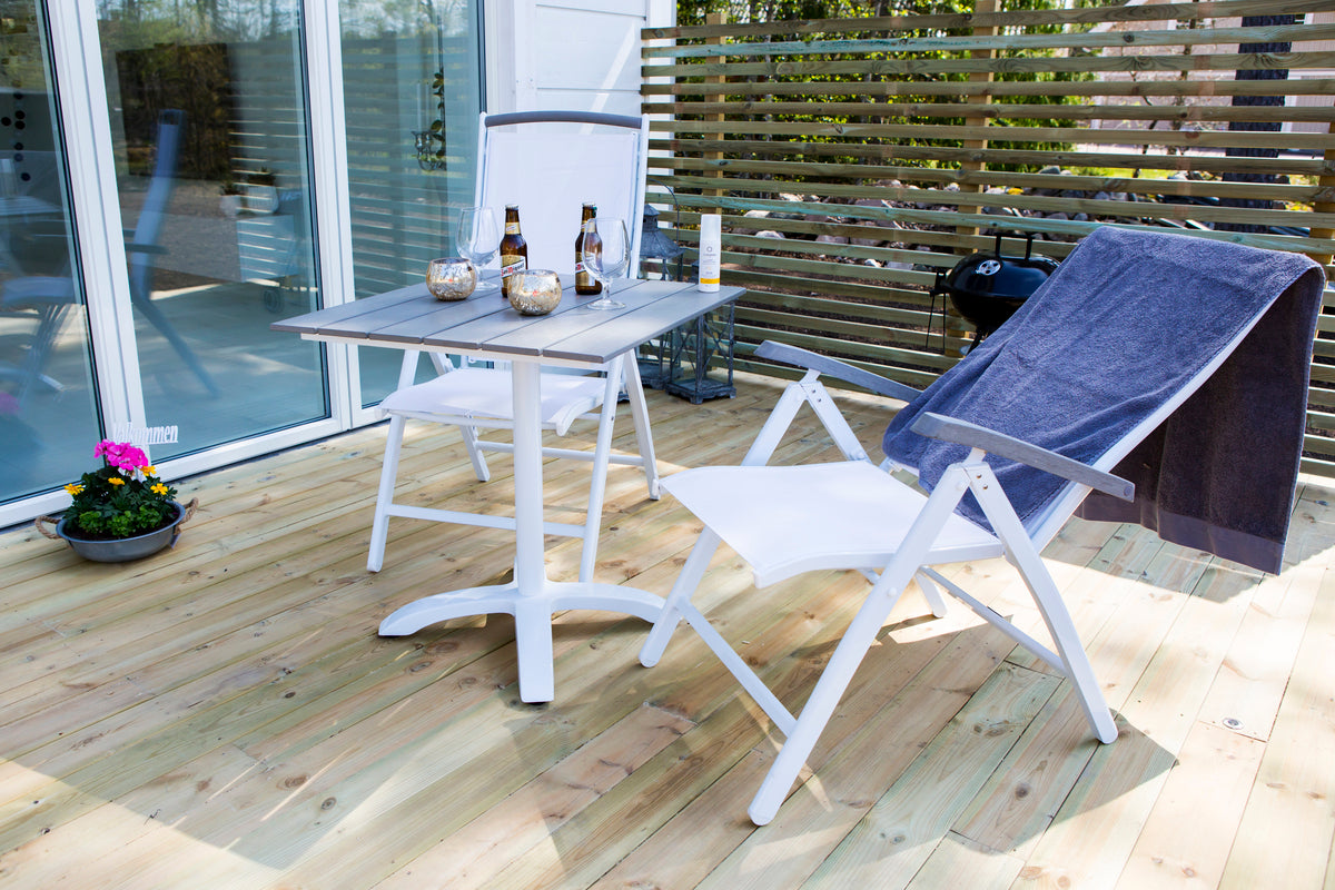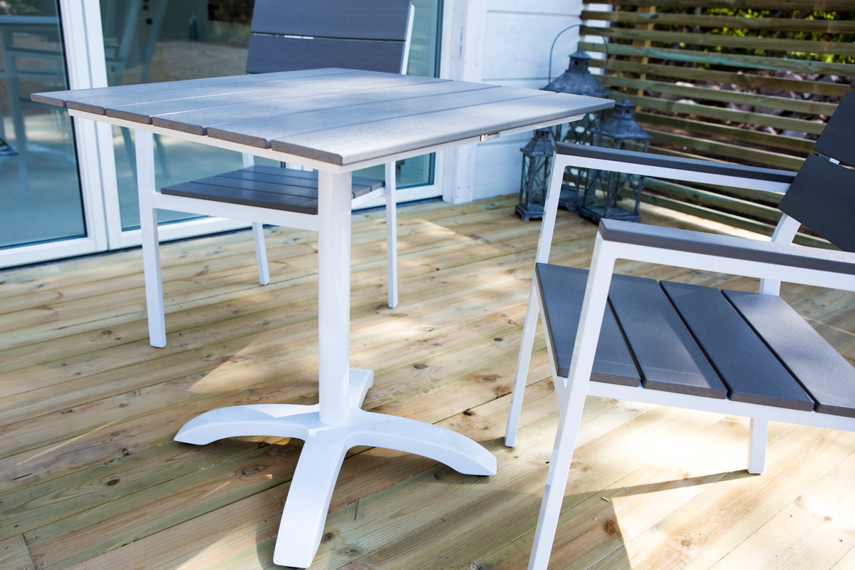 En lækkert matchende lille spisegruppe - perfekt til solrige kaffepauser! Vores kvadratiske spisebord Colorado er det perfekte cafébord med bordplade i grå aintwood og understel i hvid aluminium. Her i luksuriøs kombination med vores foldbare spisestole Albany i hvid textilene - læn dig tilbage og nyd udelivet i sommer!