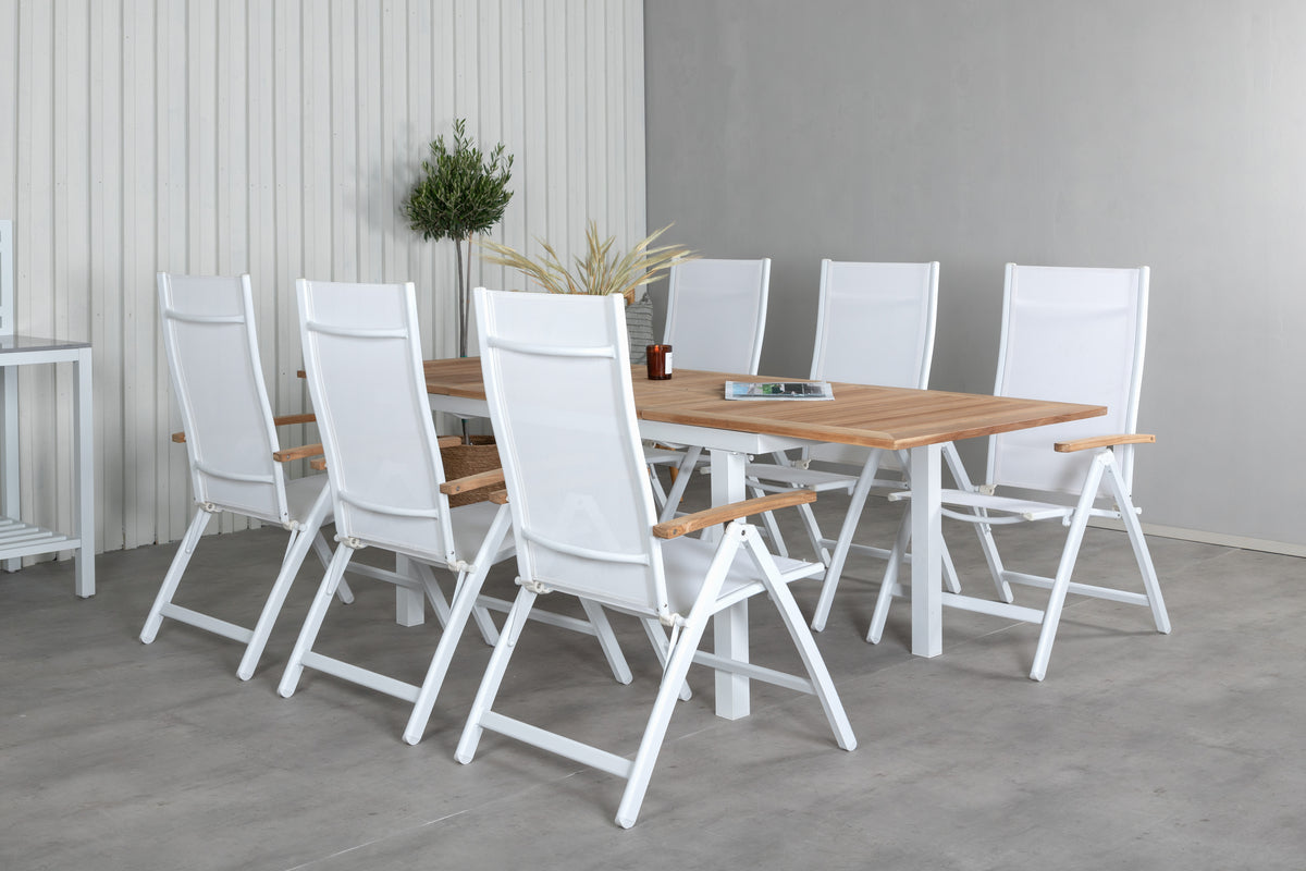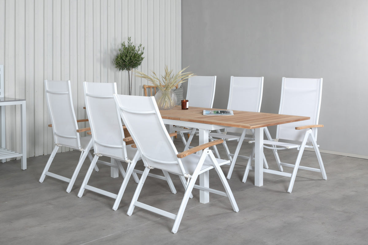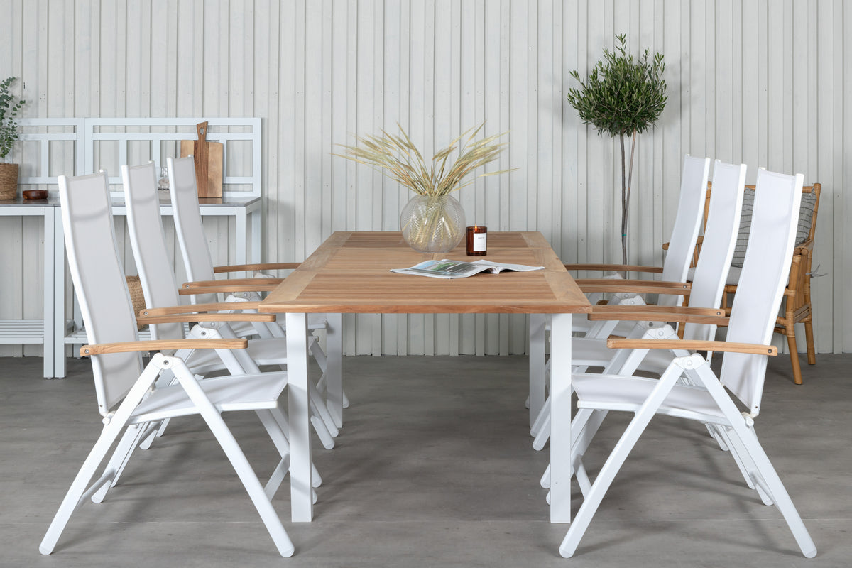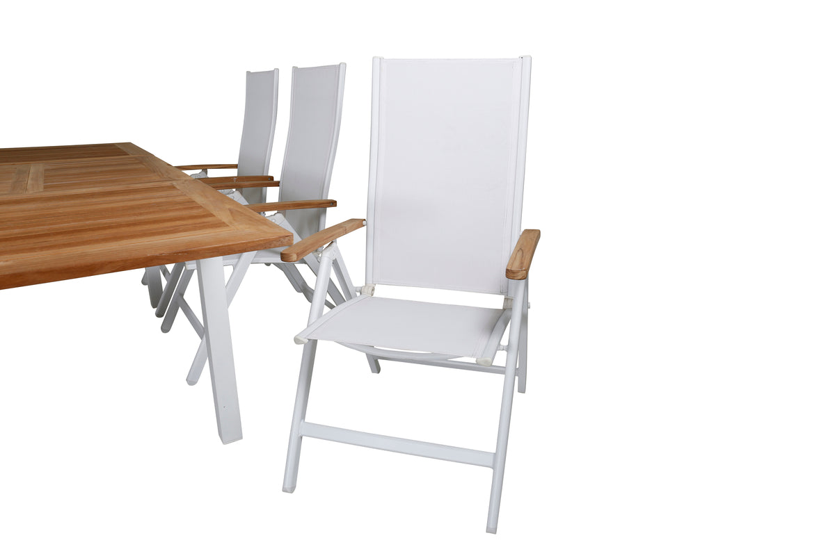 En lys og trendsikker spisegruppe i smuk teak! Panama er et forlængeligt spisebord i rektangulær form. Bordpladen er i smuk teak og understellet i hvid metal. Her sammen med vores foldbare spisestole fra serien Panama i hvid textilene med lækre detaljer i teak, som matcher bordet udmærket. Udvid middagsinvitationerne og nyd hyggelige måltider med familie og venner!