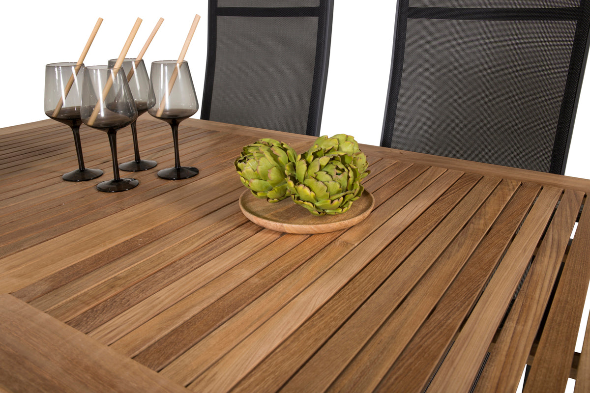 Moderne og hyggeligt! Spisebordet Panama med mulighed for forlængelse sammen med Copacabana spisebordsstole giver dig en dejlig spisegruppe til udestuen. Kombinationen af sort og træ giver et hyggeligt og luksuriøst udtryk på enhver terrasse!