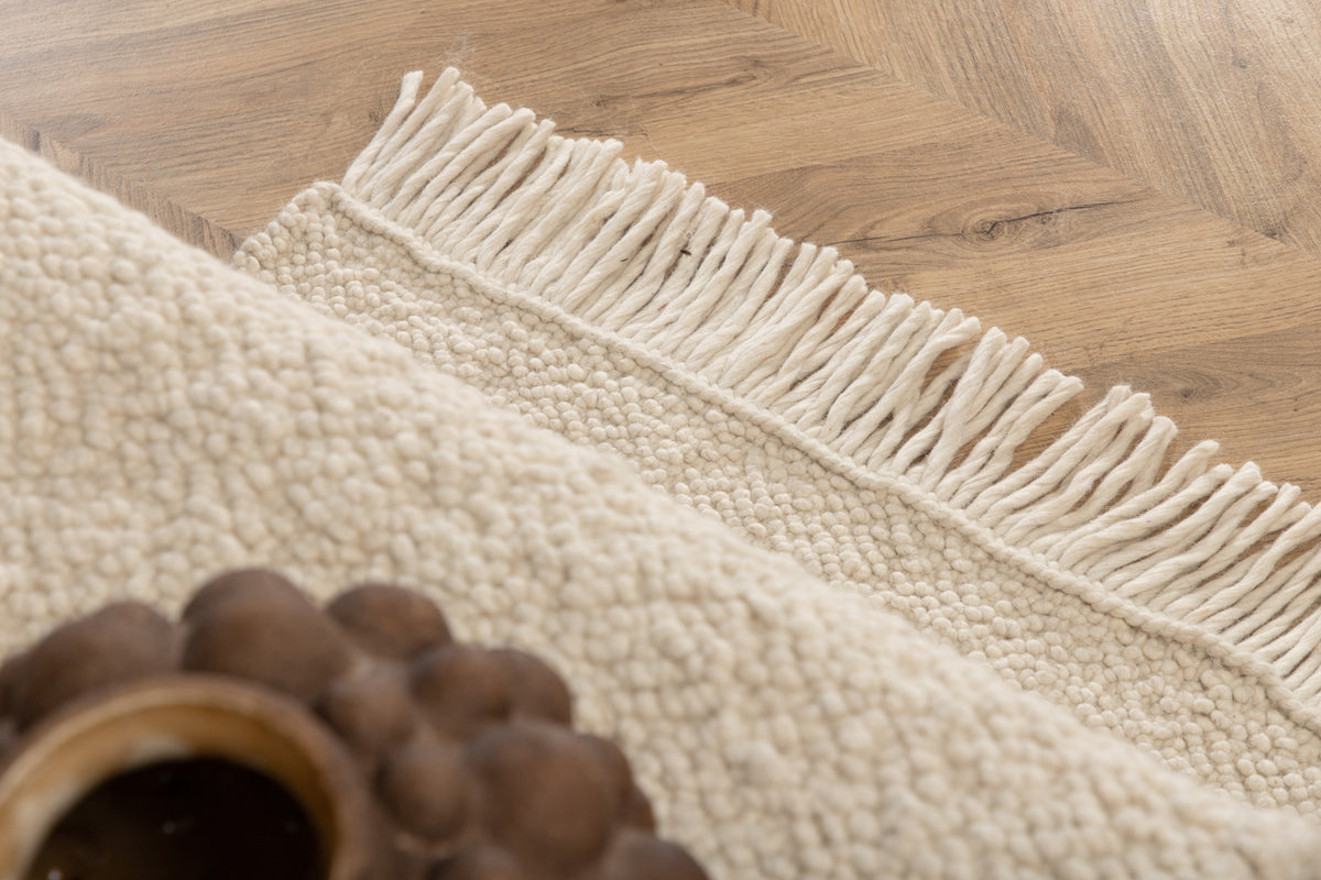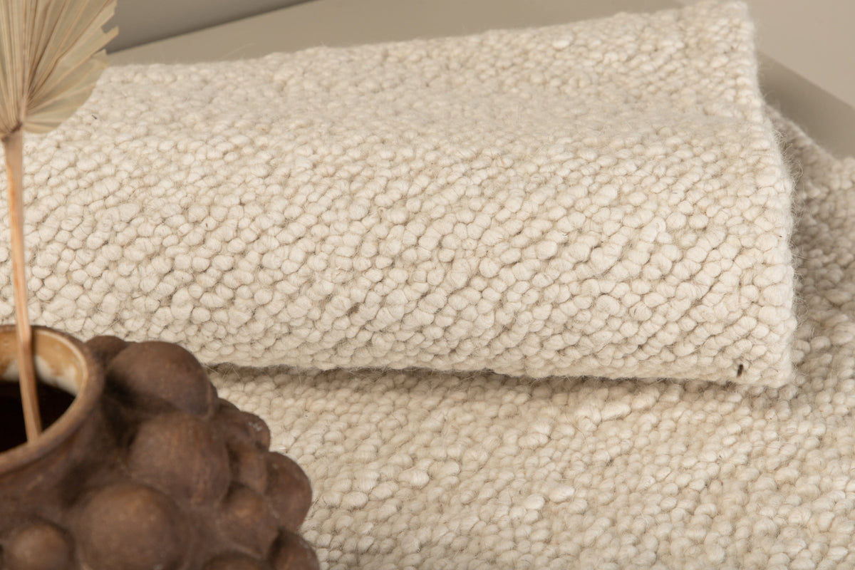 Skab et blikfang, der imponerer, og indret din stue hyggeligt med et eksklusivt uldtæppe! Tæppeserien Betina tilbyder håndvævede uldtæpper med en teknik, der giver tæppet en dejlig knude-tekstur med stor komfort at gå på og findes i forskellige størrelser og kulører - vælg hvad der passer bedst til dit hjem! Denne rektangulære skønhed har et moderne design og indbydende egenskaber. Den hvide kulør giver en varme til rummet, og den benhvide frynserække på kortsiderne bliver en lækker detalje. Materialet føles både luksuriøst og medfører flere attraktive egenskaber, som giver dig et trofast tæppe over tid. Smid fødderne op og nyd et moderne blikfang i stuen! Tæppets mål: 250x80 cm.