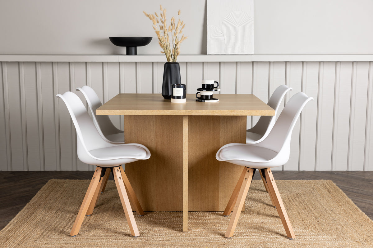 Vores træfarvede spisebord Leo er fremstillet i robust egetræsfarvet MDF og har en moderne kvadratisk bordplade. Den krydsede træramme giver bordet en unik og charmerende karakter. Bordets smarte størrelse gør, at det passer perfekt selv i det mindre køkken, hvilket gør det til en ideel løsning for alle hjem. Bordets mål: 100x100cm.