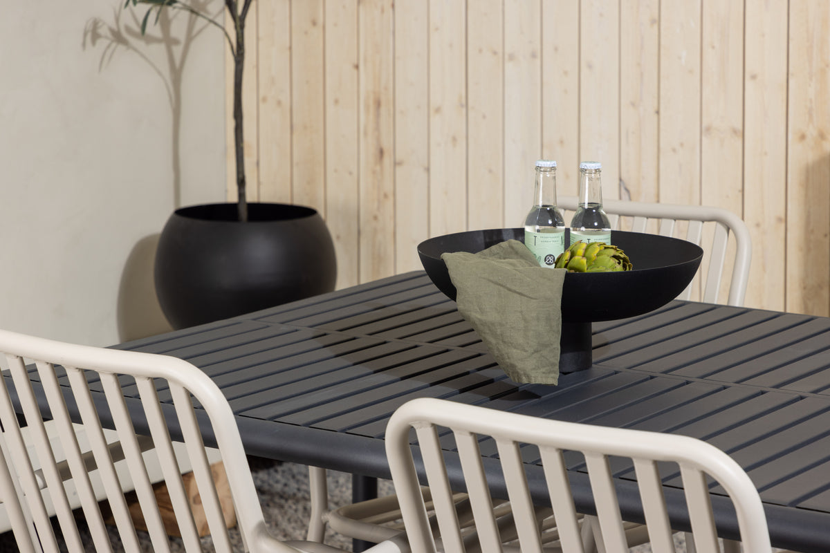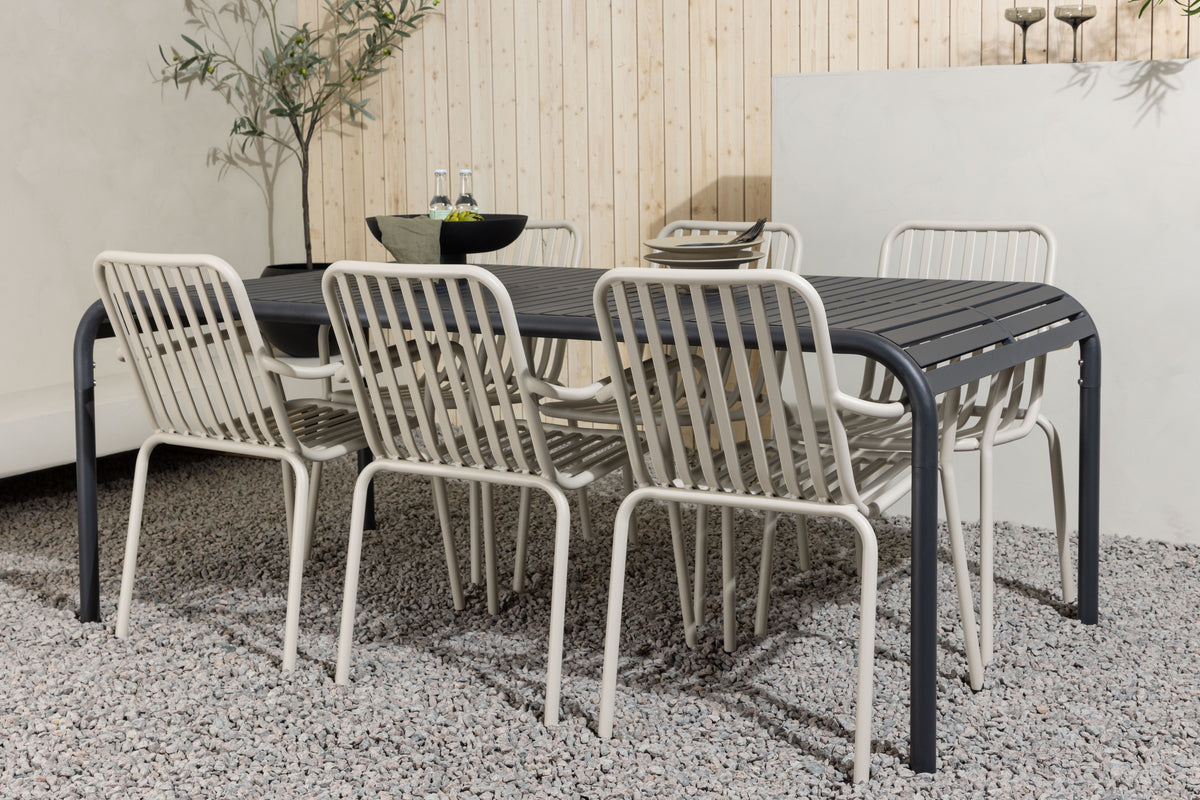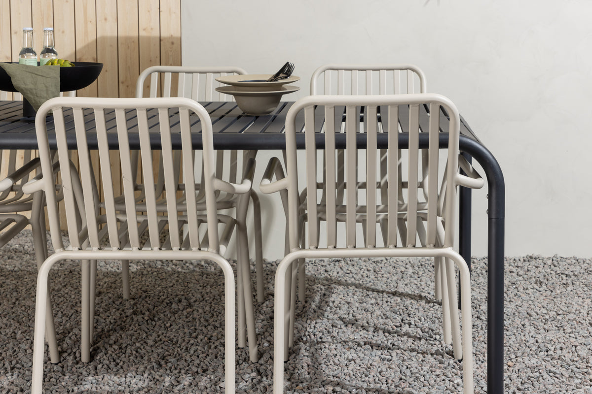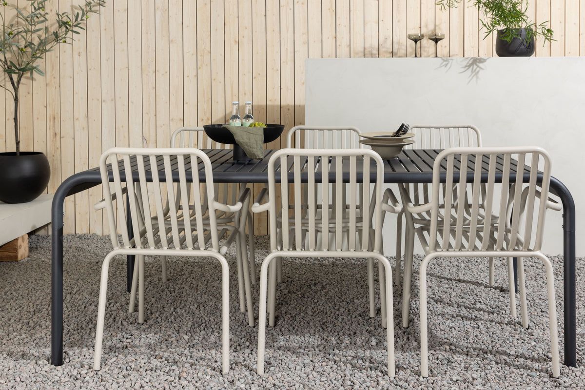 En stilren og minimalistisk spisegruppe til alle lejligheder! Det rektangulære spisebord Borneo har smidige former med en ribbet bordplade, der bølger ned langs kanterne ved benene. Gennemgående fremstillet i det slidstærke materiale aluminium. Her i charmerende kombination med beige spisestole fra serien Peking. Stolen har også et ribbet udførelse med integrerede armlæn og er gennemgående i beige aluminium. Møbler på terrassen eller i udestuen og inviter til dejlige måltider fremover! Bordets mål: 200x100x75cm.