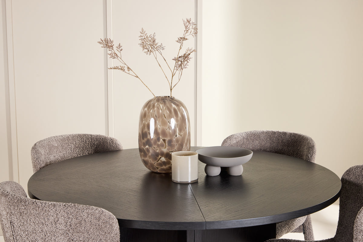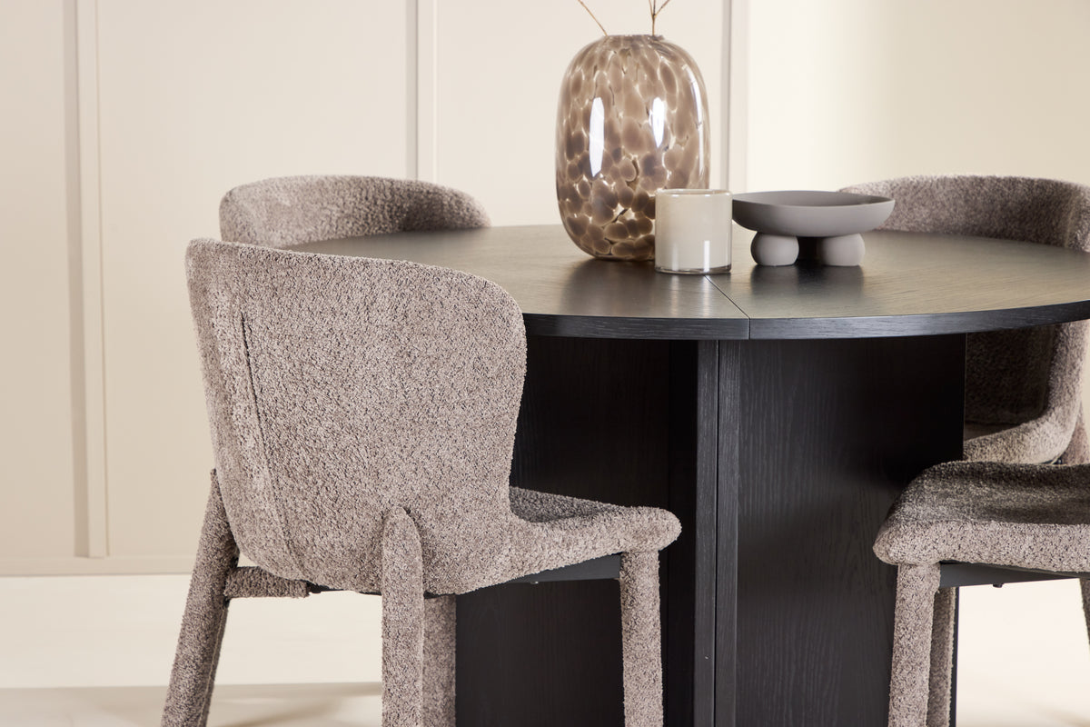 Den sorte fineret trækonstruktion giver bordet en tidløs og elegant følelse, som smelter ind i forskellige indretningsstile og skaber en smuk kontrast i rummet. Forlængerfunktionen er enkel at bruge, hvilket gør det let at tilpasse bordet efter dine behov. Tilsammen skaber spisestolen Astoria og spisebordet Strada en harmonisk og stilfuld spiseplads, hvor hvert måltid bliver en luksuriøs og behagelig oplevelse. Kombinationen af den elegante bouclé og det stilrene sorte fineret træ forhøjer rummets æstetik og giver en tidløs følelse af kvalitet og design.