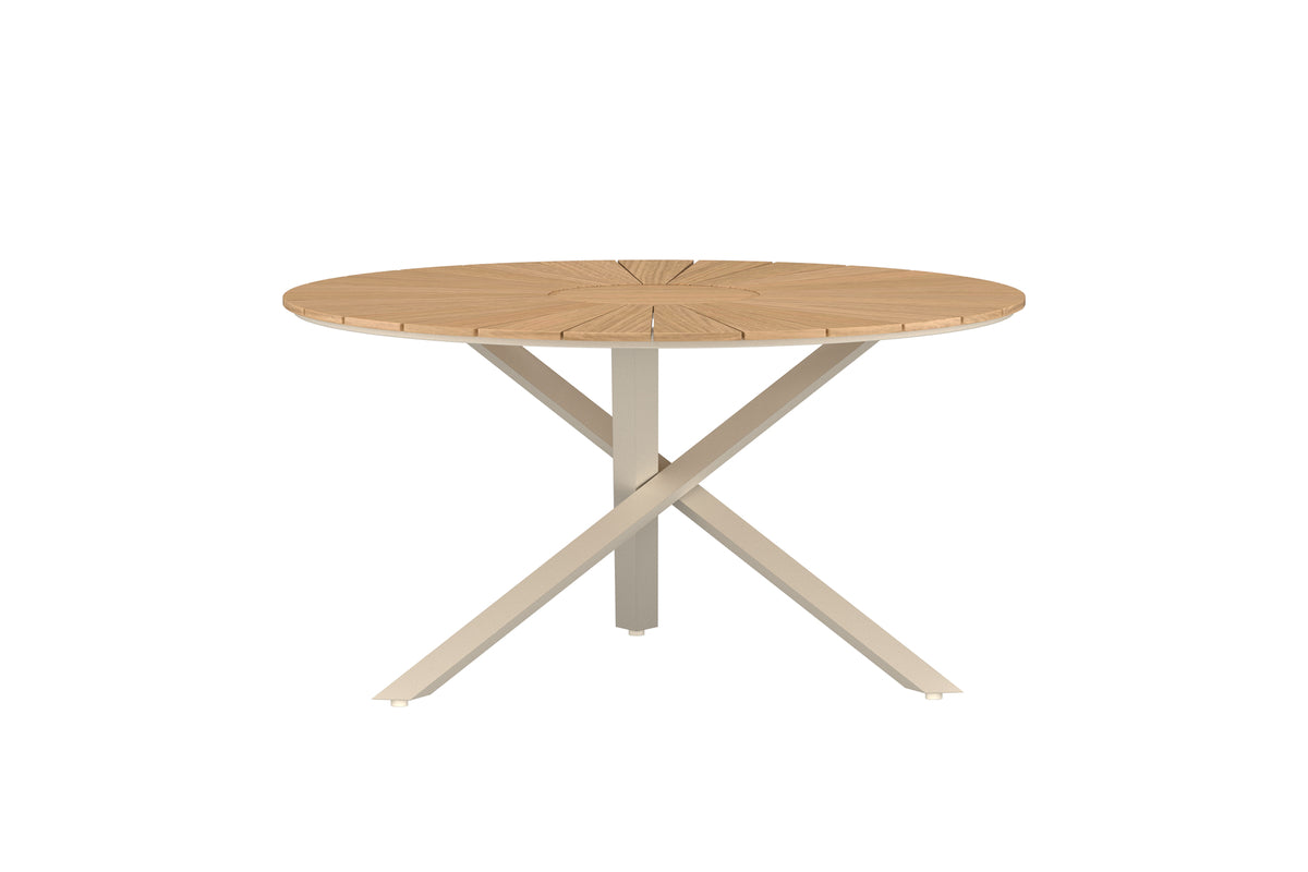 Mexico spisebord er et elegant, rundt bord, der kombinerer moderne design med naturlige materialer. Bordet har en ramme i beige aluminium og en smuk bordplade i teak med et vifteinspireret mønster, der giver en eksklusiv følelse. Takket være den runde form bliver bordet et naturligt samlingspunkt for måltider og samvær, mens teakpladen tilfører varme og karakter. Mexico spisebord er det perfekte valg for dig, der ønsker en stilren og tidløs spiseplads udendørs.