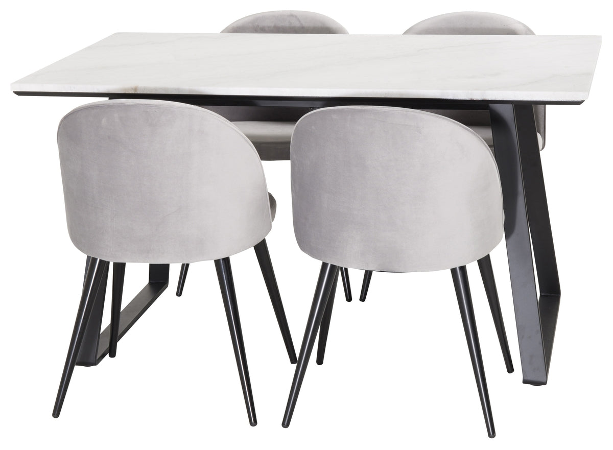 At kombinere forskellige farver og forskellige materialer på stole og borde er ofte en stor succes. Her får du et elegant spisebord fra Estelle og vores grå spisestole fra serien Velvet – moderne, komfortabelt og tidløst.