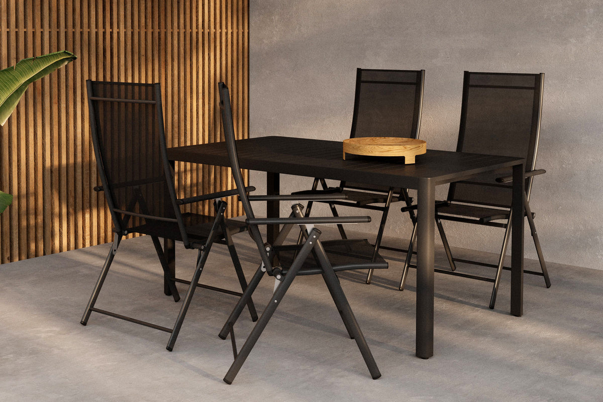 Skab en moderne og indbydende spiseplads udendørs med Giardini spisegruppe, bestående af Giardini spisebord i sort aluminium og fire Levanzo spisestole i sort stål og textilene. Det stilrene design og holdbare materialer gør denne spisegruppe perfekt til terrassen, udepladsen eller haven.