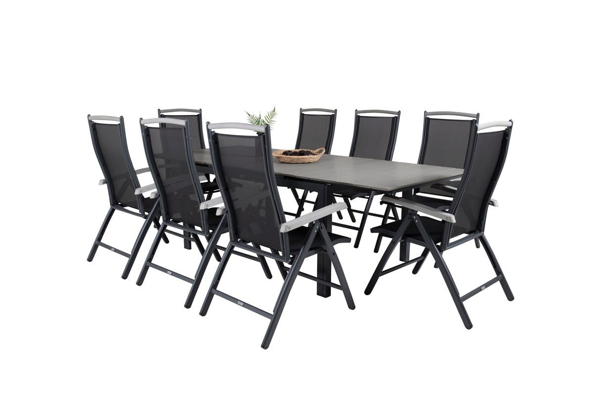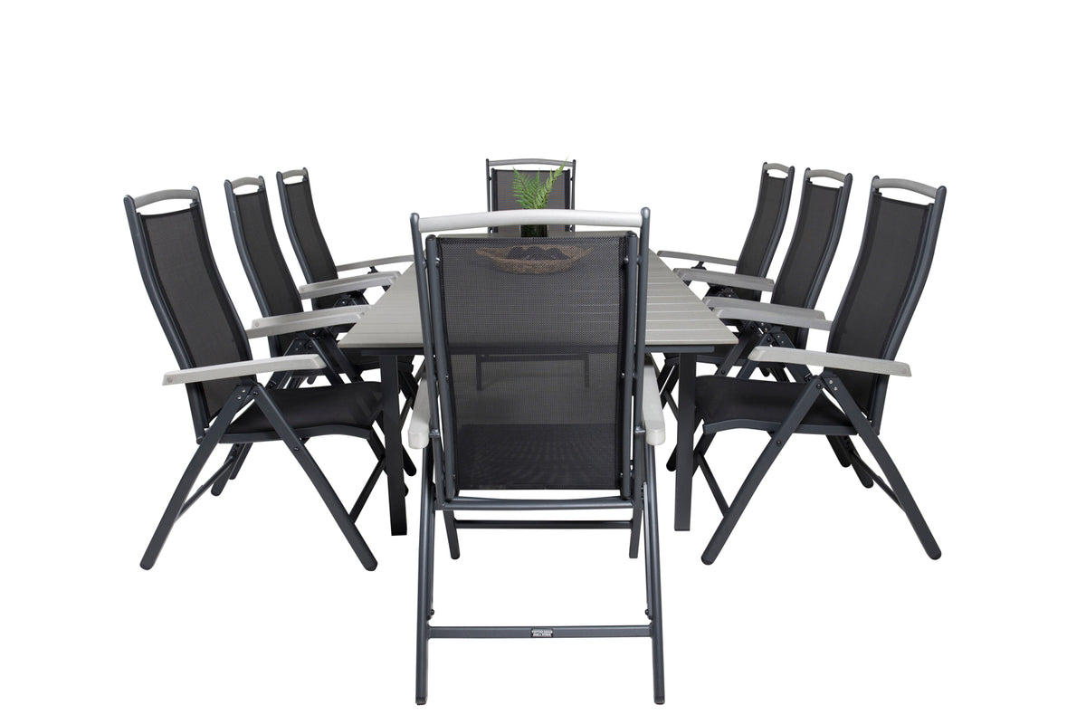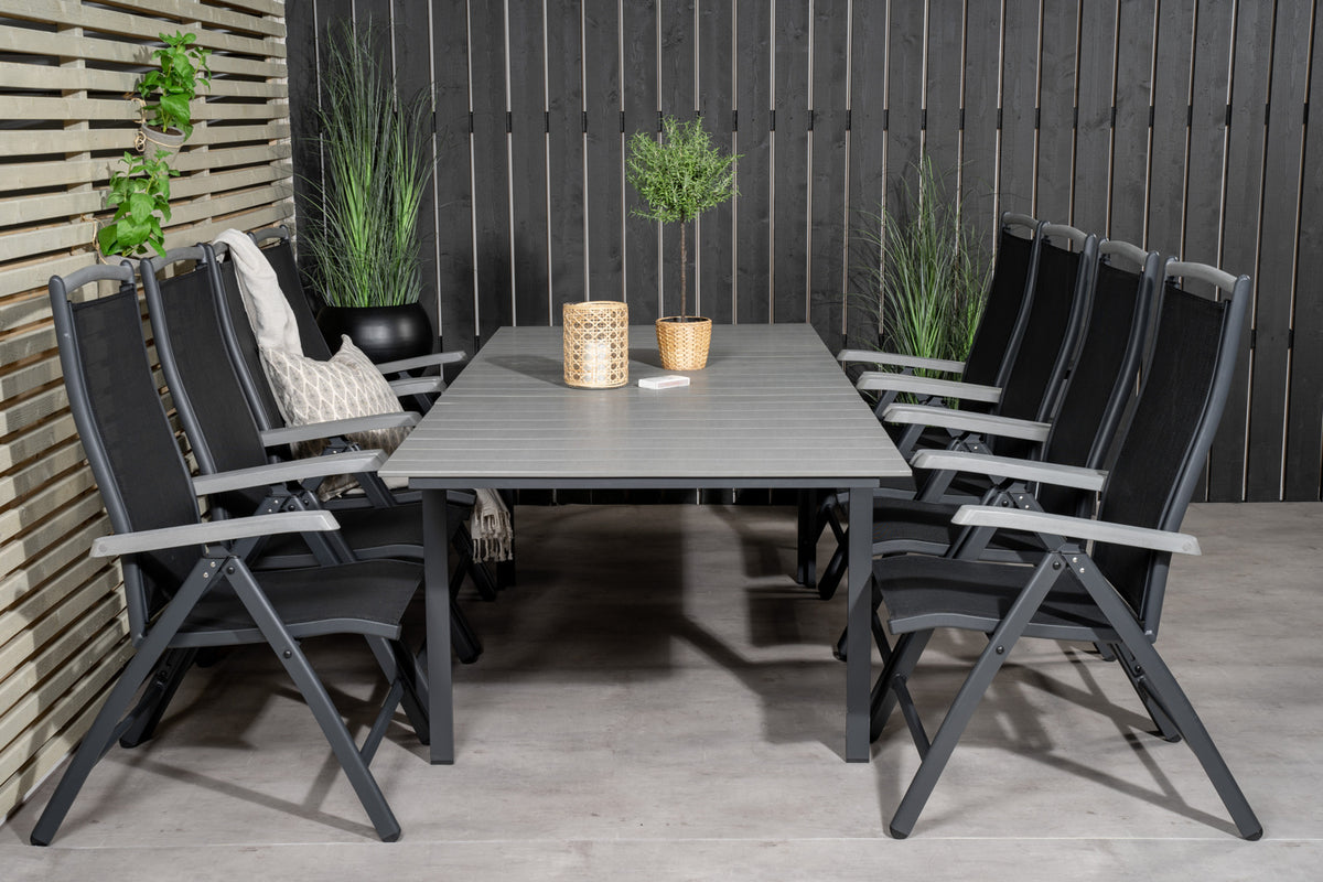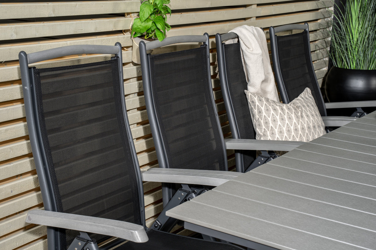En stilren spisebordsgruppe i klassisk stil! Her kombinerer vi spisebord Levels i lækker gråskala sammen med bekvemme spisestole i serien Albany. Et bord med masser af plads til middage og samvær - så udvid dine middagsinvitationer og nyd herlige sommeraftener sammen på terrassen!