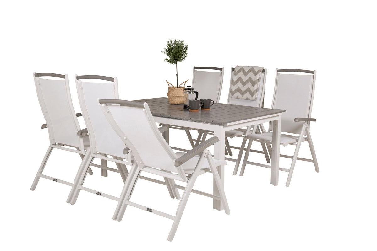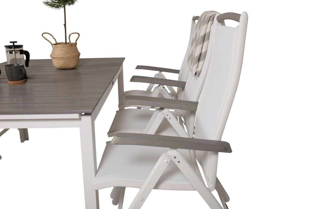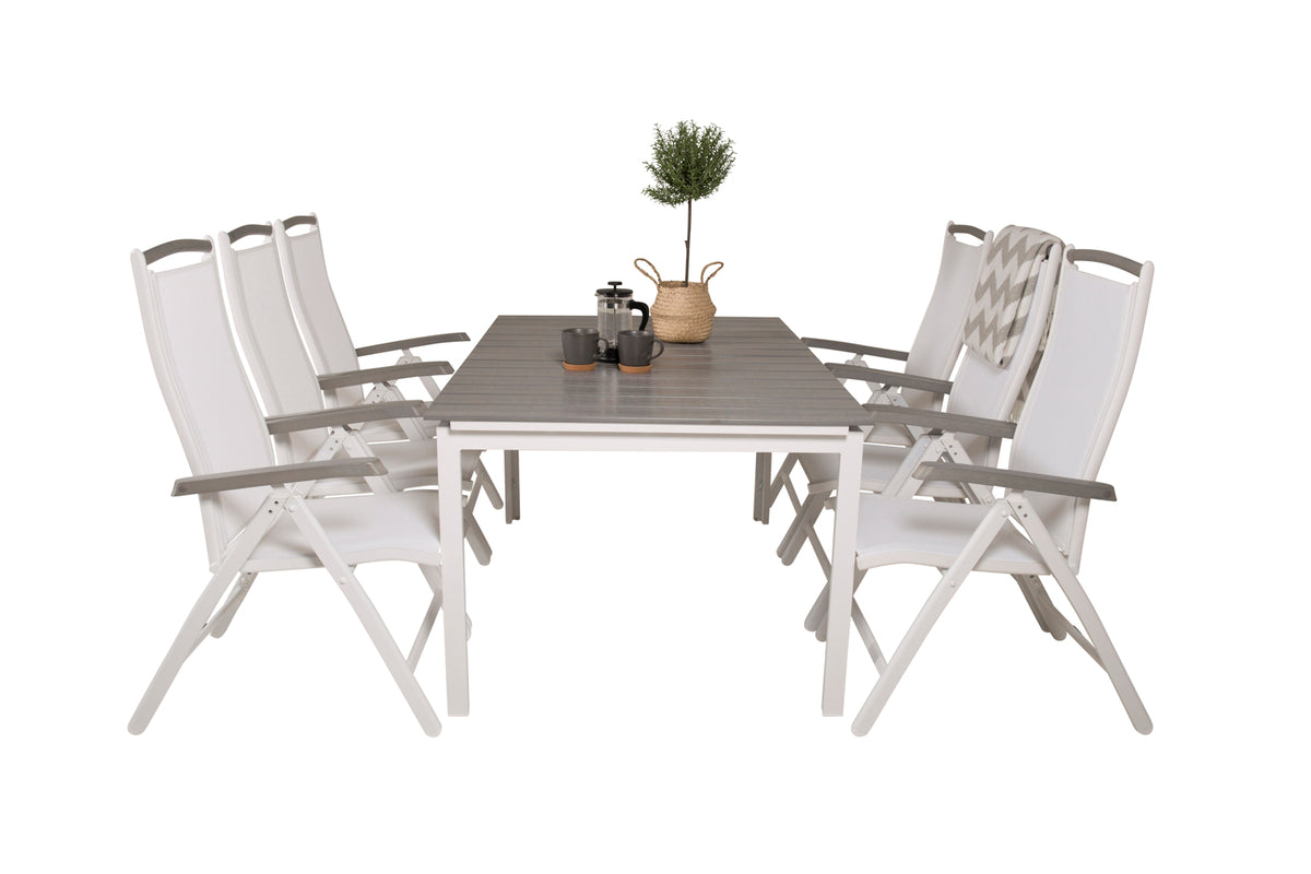 Moderne og tidløst! Gør dig klar til udesæsonen med denne dejlige spisegruppe. Med det forlængelige spisebord Levels og de forlængelige spisebordsstole Albany slipper du for at bekymre dig om pladsen. Invitér til mange sociale stunder fremover!