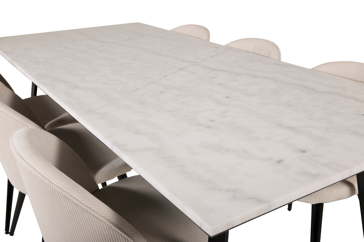 Skab et hyggeligt midtpunkt i hjemmets hjerte med et stilrent spisebord fra serien Estelle! Dette rektangulære spisebord har en lækker bordplade i hvid/grå marmor og et understel i metal. Det elegante design gør, at spisebordet passer lige så godt til fest som til hverdag!