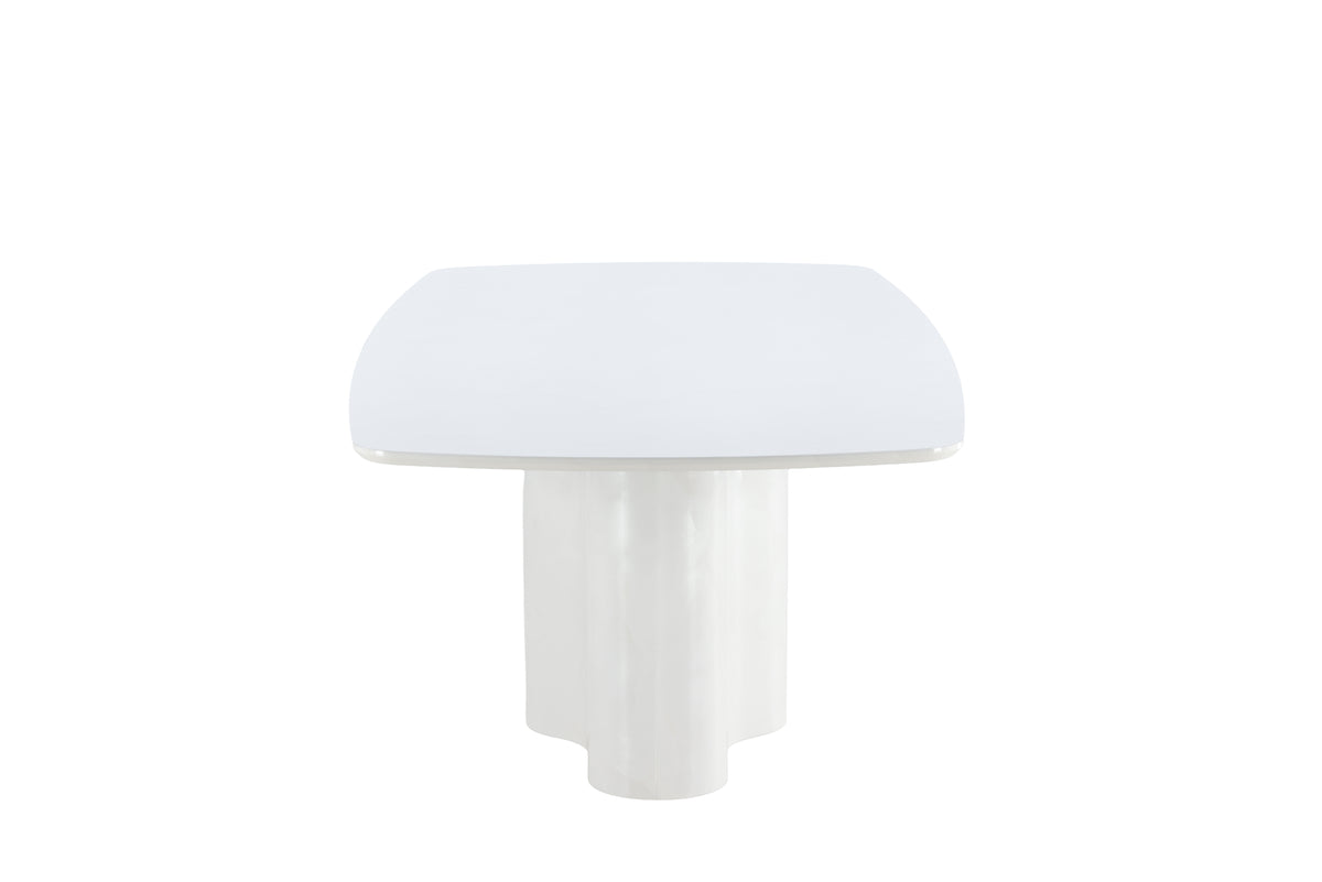 Det centrerede bordben giver ikke kun en unik visuel balance, men også ekstra benplads og frihed i møbleringen. Den hvide farve bidrager til et lyst, luftigt udtryk, der løfter rummet og skaber en indbydende atmosfære.