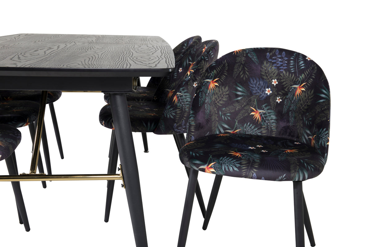 Spisebordet Gold sammen med spisebordsstole i velour fra serien Velvet. Bordet har luksuriøse guld detaljer forneden og er forlængeligt. En spisegruppe der fungerer lige så godt til hverdag som til fest.