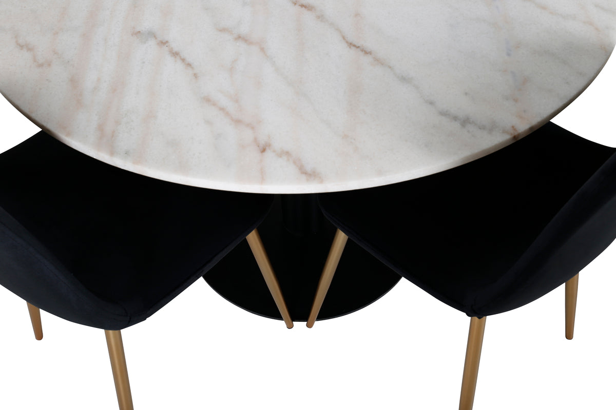 Vores moderne marmorlignende spisebord Estelle sammen med komfortable sorte spisestole i serien Polar. Her får du en spisegruppe, der straks giver et luksuriøst og elegant indtryk.
