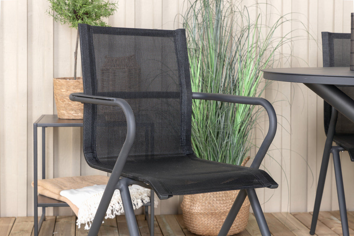 At købe en færdigkomponeret spisegruppe er både trendsikkert og praktisk! Her kombinerer vi vores runde spisebord Alma i sort farve sammen med vores stilrene spisestole Alina i behagelig sort farve, fremstillet i textilene. Lad terrassens hjerte være præget af din nye iøjnefaldende spisegruppe - her havner ingen på kanten!