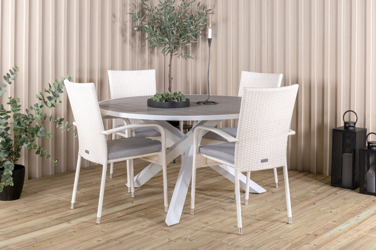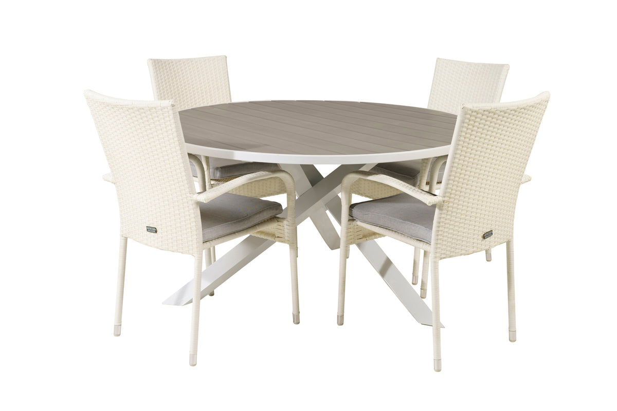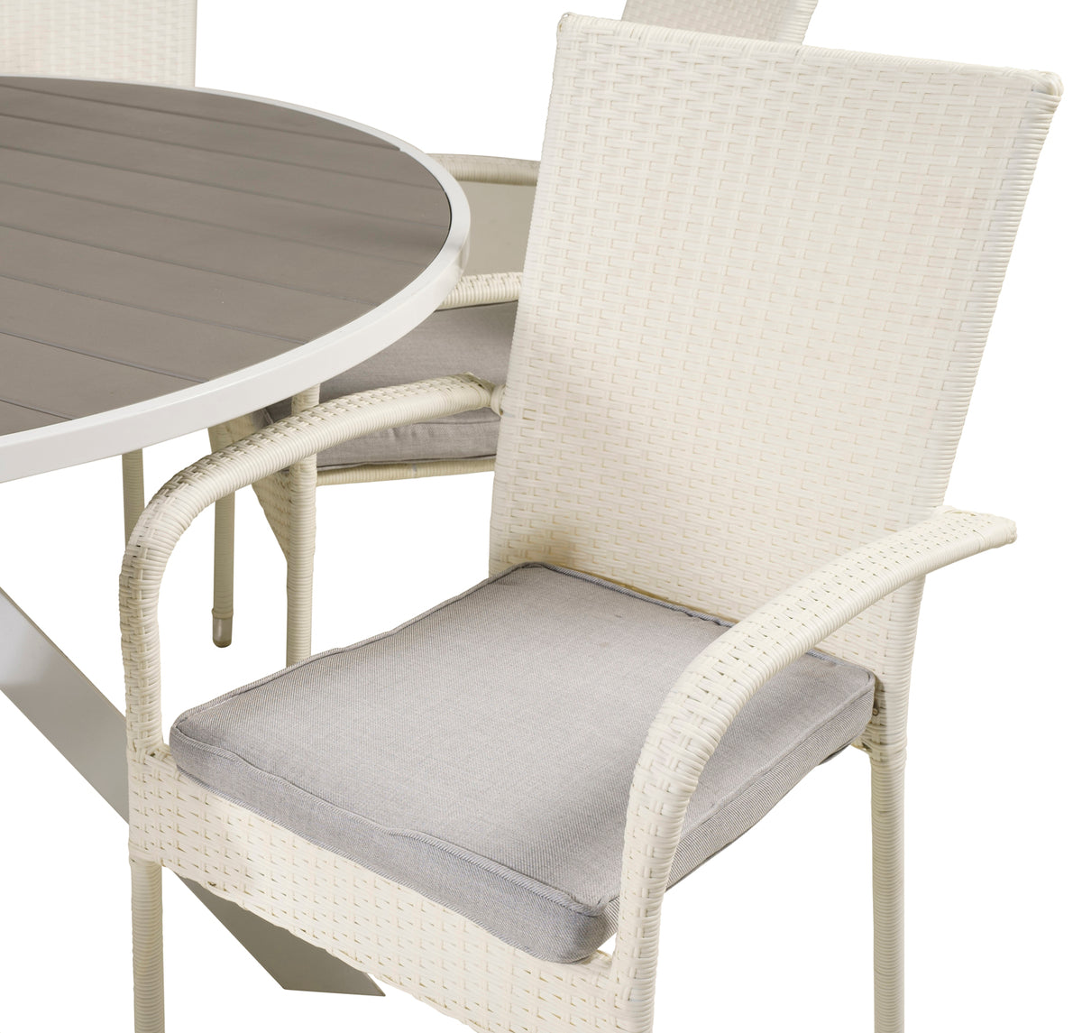 Moderne og hyggeligt! Spisebord Parma sammen med Anna spisestole i hvid kunstflet giver dig en spisegruppe at længes hjem til en varm sommeraften. Møblér og gør dig klar til udesæsonen – på bedste vis!