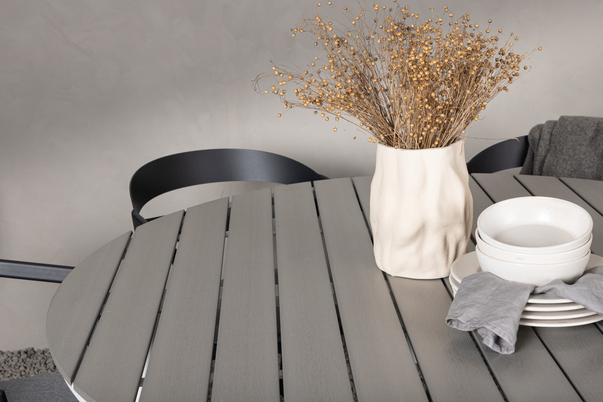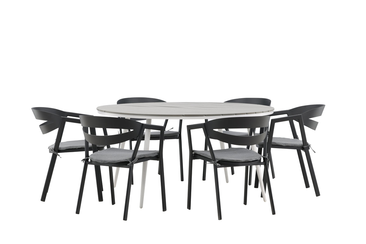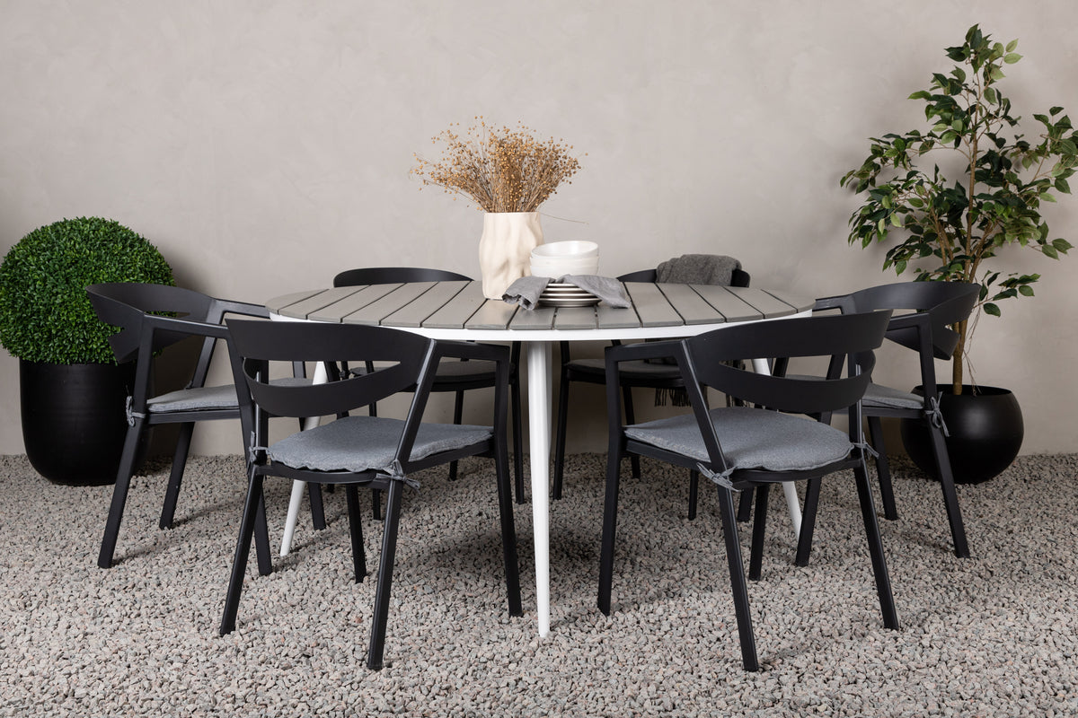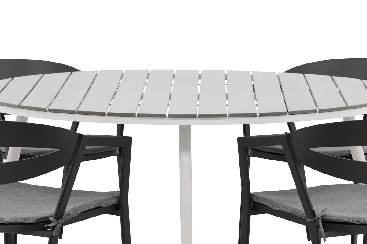 En rund spisegruppe, der kombinerer tidløst design med indbydende former! Spisebord Break har et klassisk design med en rund bordplade i grå aintwood og let udadgående ben i hvid aluminium. Mål: 150ø cm. Her i perfekt kombination med komfortable spisebordsstole fra serien Slit. Stolene har integrerede armlæn i sort aluminium og en grå hynde for ekstra komfort. Skab det perfekte sted på din terrasse til sommerens måltider!