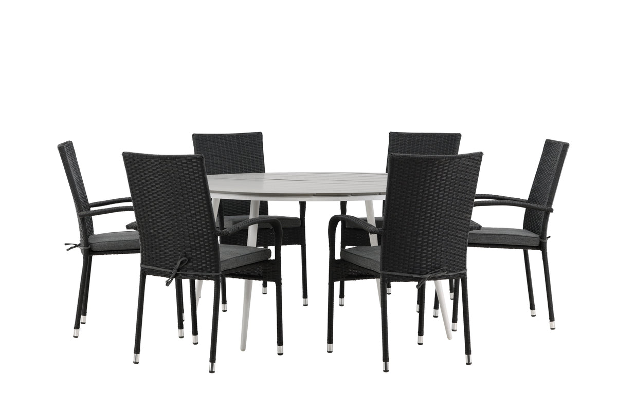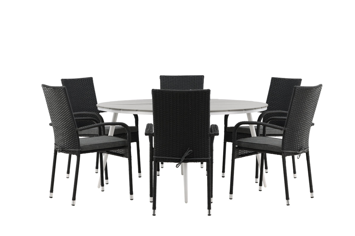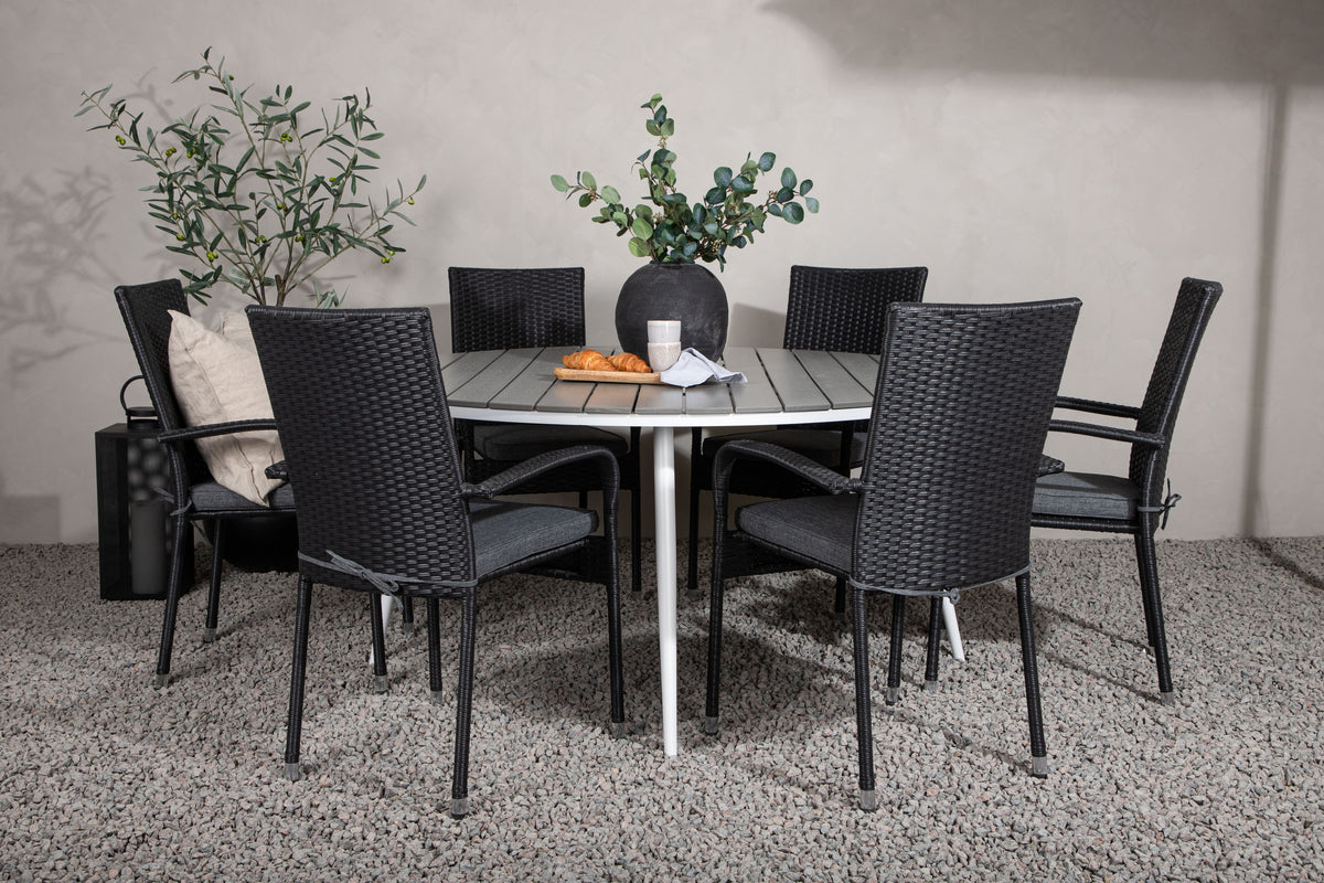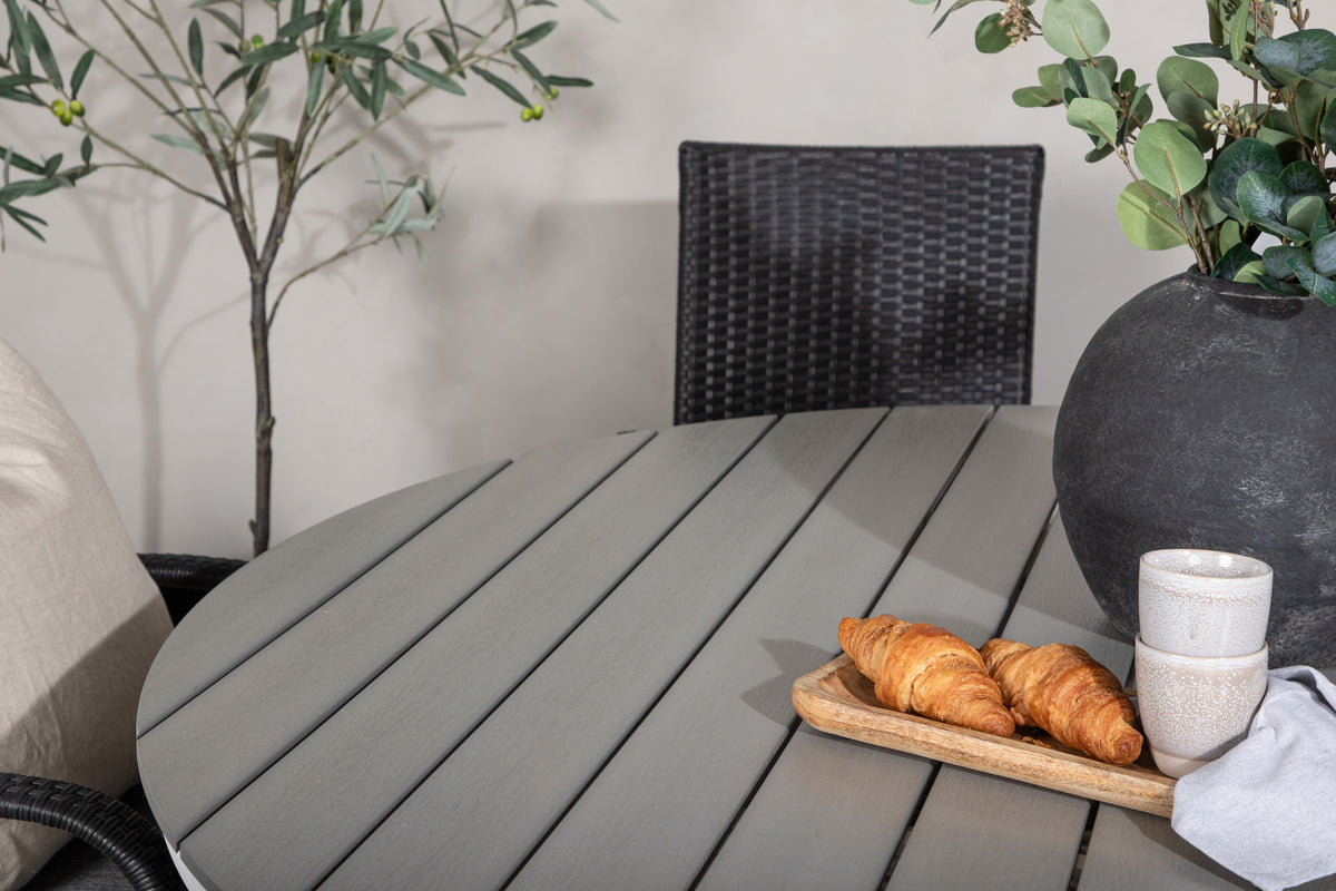 En rund spisegruppe er perfekt til at skabe en indbydende atmosfære - her havner ingen på kanten! Spisebord Break har en rund bordplade i grå aintwood og et klassisk understel i hvid aluminium. Her i lækker kombination med sorte spisebordsstole fra serien Anna. Stolen er fremstillet i det slidstærke og udendørsvenlige materiale kunstrattan og er også stabelbar for praktisk opbevaring. Invitér til hyggelige måltider til sommer!