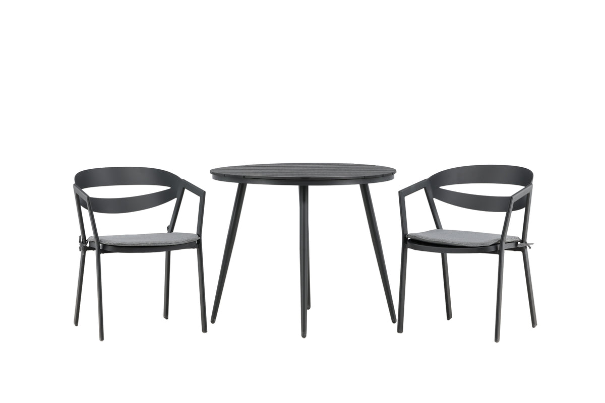 Bekvem, indbydende og nydelig café-gruppe i behagelige kulører - enkel at matche og tidløs i sit udformning! Bordet Break har en rund bordplade i aintwood og et klassisk understel i sort aluminium. Mål: 90ø cm. Her i perfekt kombination med bekvemme spisestole fra serien Slit. Stolene har integrerede armlæn i sort aluminium og en grå hynde for ekstra komfort. Skab den perfekte kaffeplet på din terrasse!
