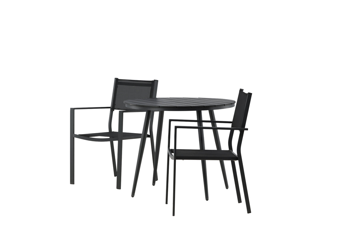 En indbydende spisegruppe for to, der garanteret forlænger hyggelige stunder til sommer! Bordet Break har en rund bordplade i aintwood og et klassisk understel i sort aluminium. Mål: 90ø cm. Her i modebevidst kombination med vores populære spisestole Copacabana. Stolene er stabelbare med et sæde i sort textilene og ramme i aluminium. Skab en charmerende plads på terrassen, der passer perfekt til sommerens alle kaffestunder!