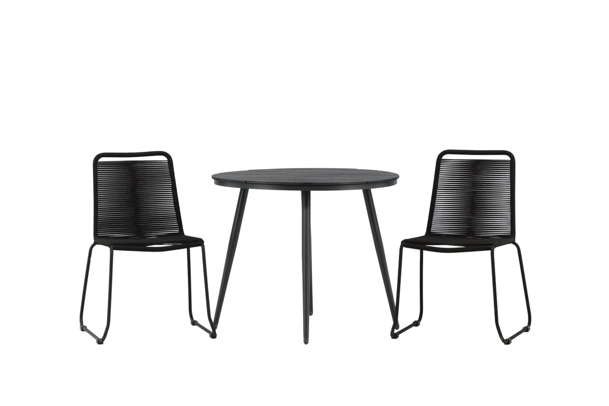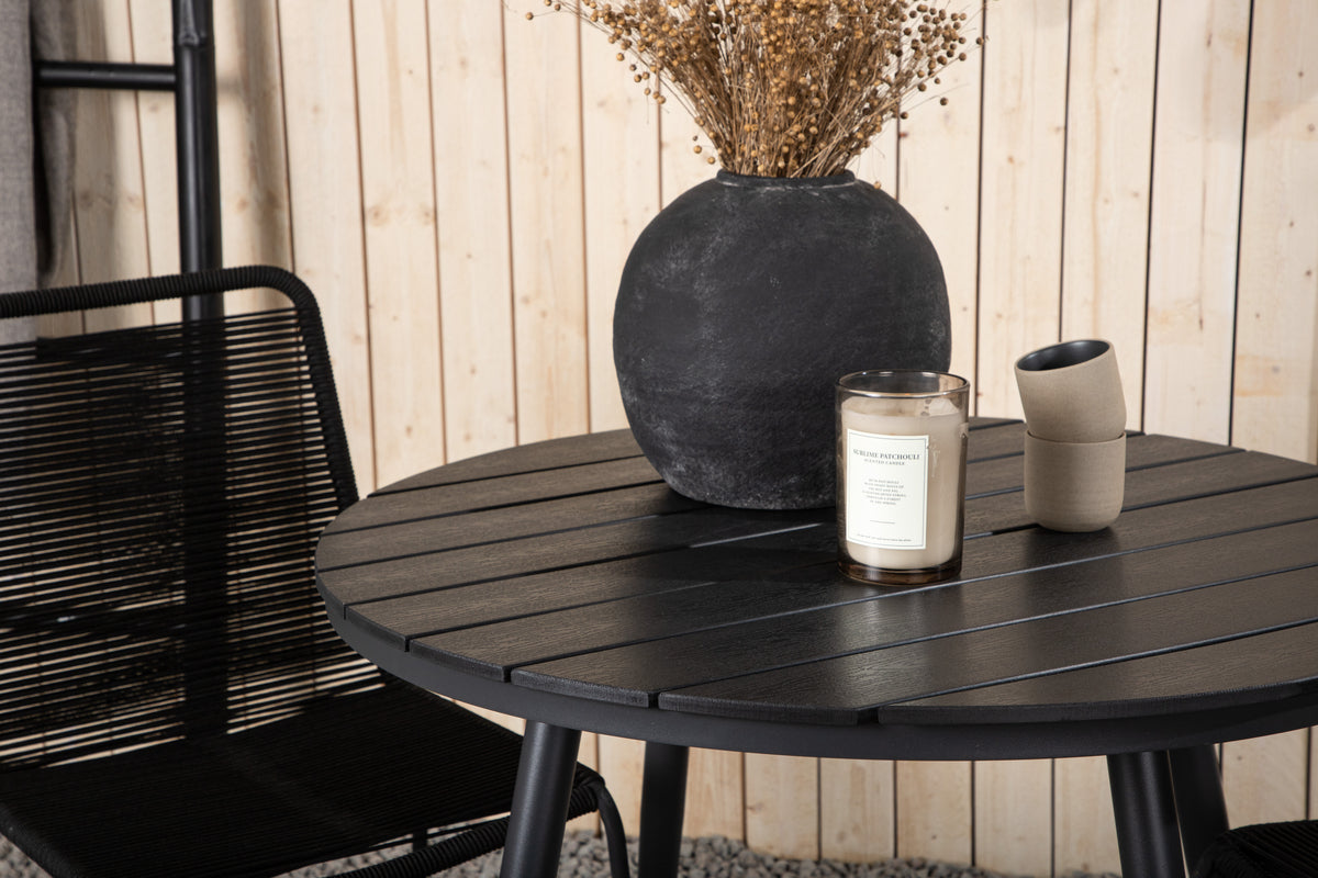Den perfekte kaffeplet til sommer! Bordet Break har et klassisk udførelse med en rund bordplade i aintwood og et understel i sort aluminium. Mål: 90ø cm. Her i moderne kombination med 2 stk. sorte spisestole fra serien Lindos. Stolene har stilrent smalle ben i sort aluminium og et sæde i slidstærkt, sort reb. En charmerende spisegruppe i gennemgående sort kulør, der sikkert vil løfte din terrasse til næste niveau!