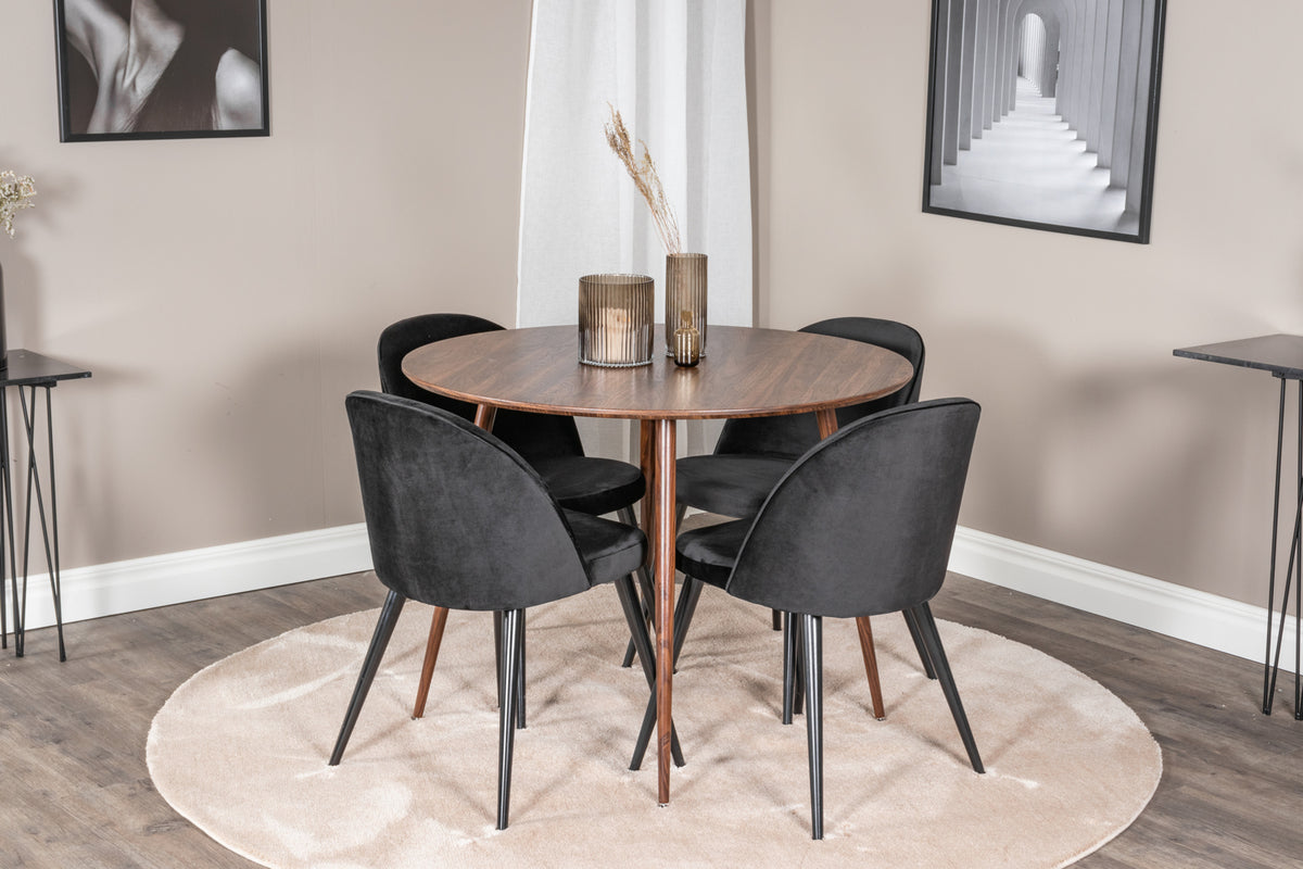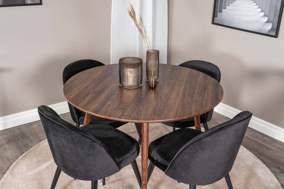 Stilrent træ kombineres med elegant sort velour! Vores runde spisebord Plaza i klassisk stil sammen med spisebordsstole Velvet i smækker design! En tidløs spisegruppe til alle lejligheder!