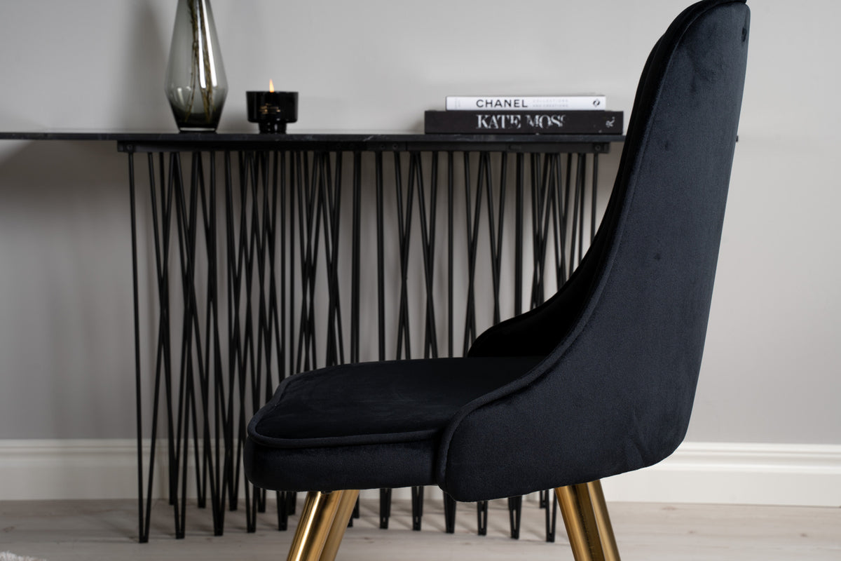 Her har vi en moderne spisegruppe, der både er fræk og elegant i sit design! Spisebordet Dipp giver en familiær følelse til rummet. Her sammen med vores trendsikre spisebordsstole Velvet med lækre stoleben i guld.