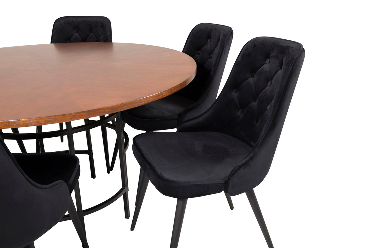 Spisebord Copenhagen med en smuk brunfarvet bordplade og et dekorativt understel i sort metal sammen med vores komfortable spisebordsstole i serien Velvet får du kombinationen – moderne, hyggeligt og luksuriøst!
