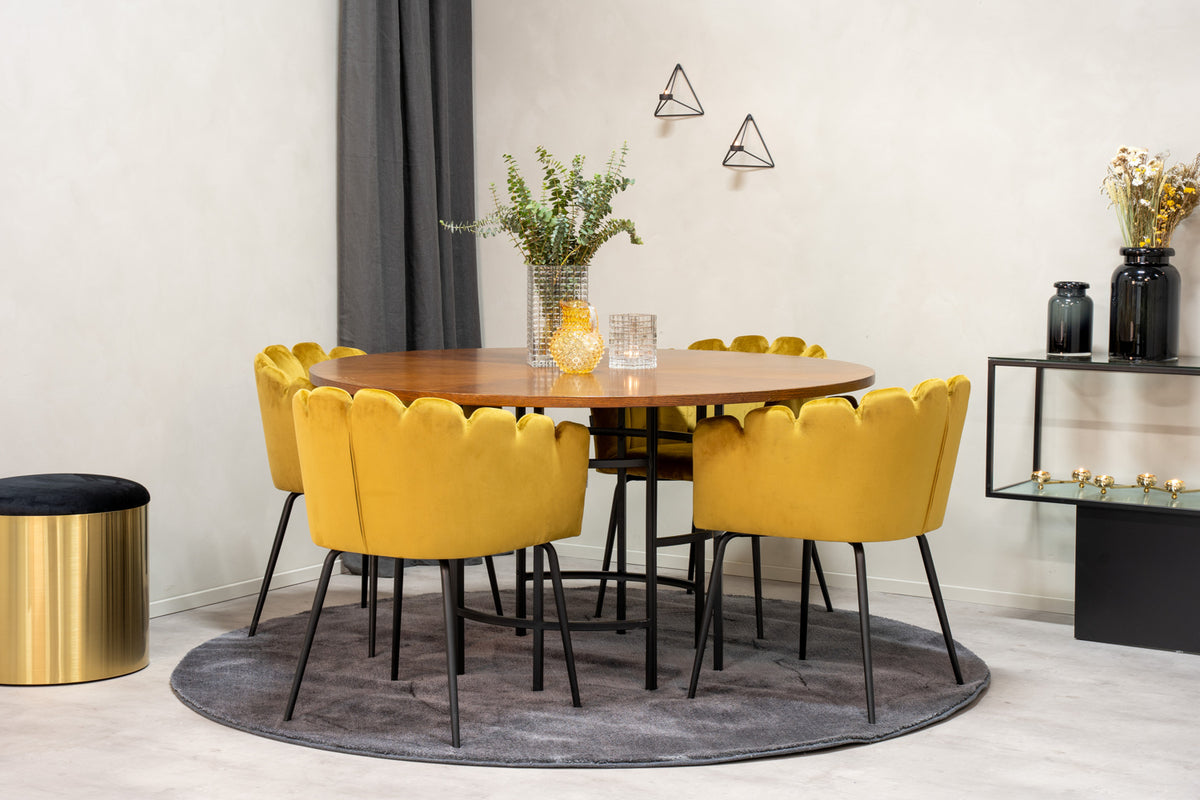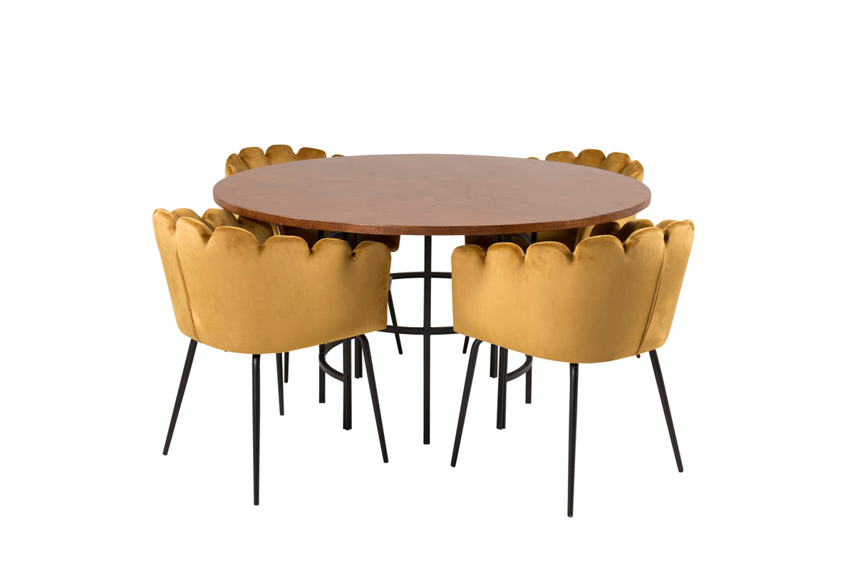 Rund matgruppe med en dejlig aura fra kollektionen Furniture Fashion. Her blandes materialer og farver til en fantastisk kombination. Bord Copenhagen sammen med karmstole i serien Limhamn.