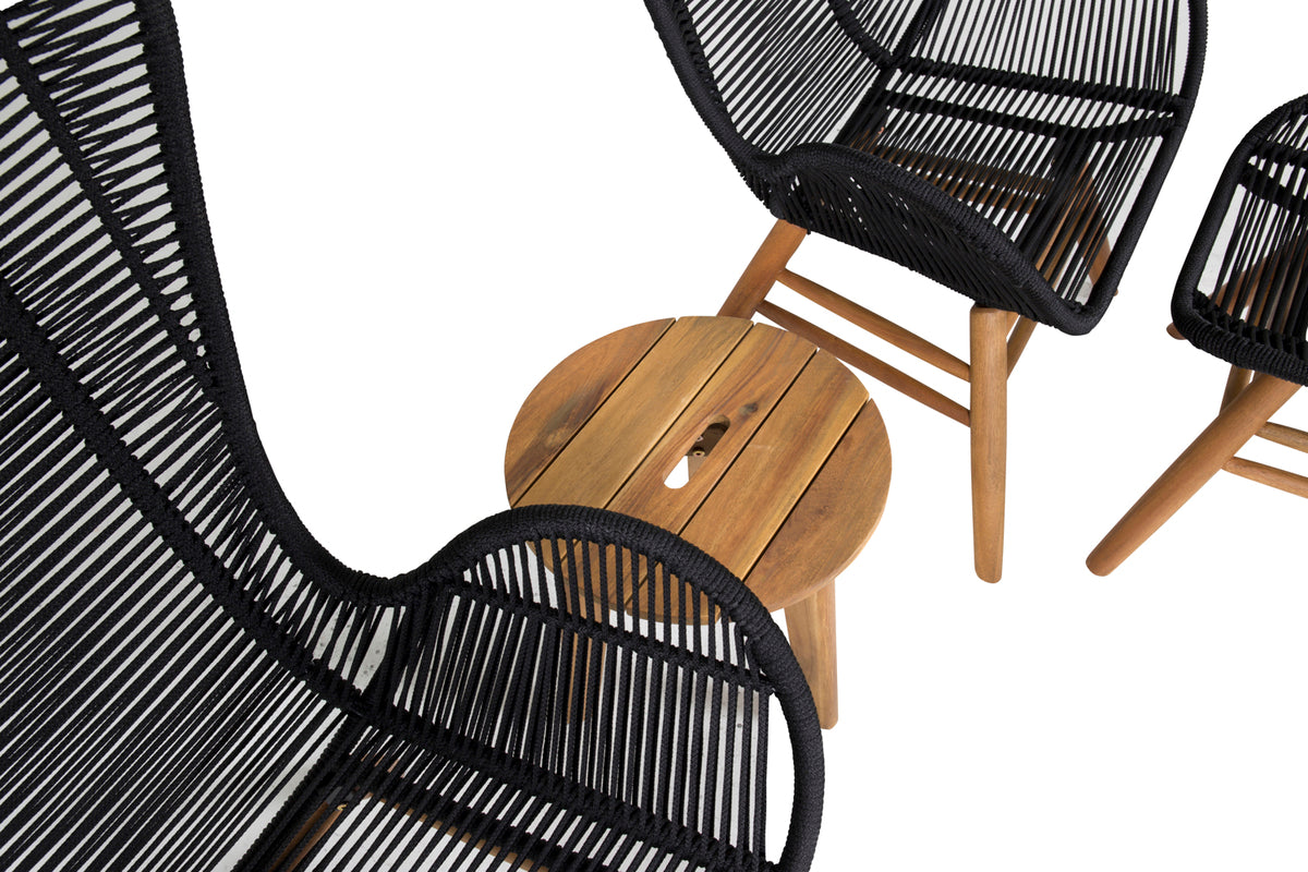 To loungestole med tilhørende ottomaner i serien Tjingeling og et sidebord i serien Chania. Her får du en smagfuld og indbydende loungegruppe, som holder over tid. Lænestolene og ottomanerne er fremstillet i et slidstærkt rebmateriale, sidebordet er fremstillet af akacie. Nyd sommeren - dette loungesæt er lige så flot, som det er bekvemt!