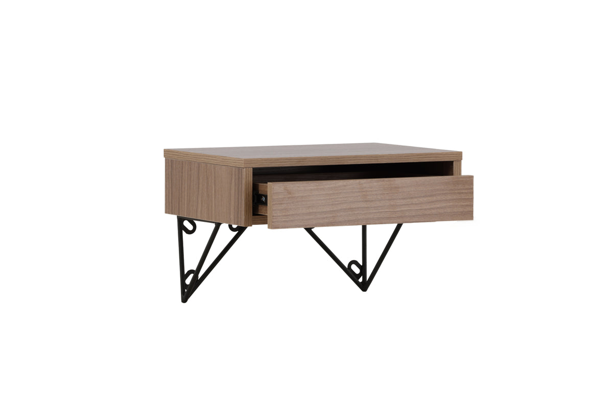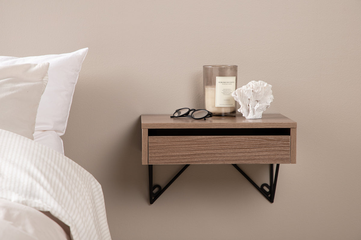 Et charmerende sidebord, der er perfekt til at hænge på væggen ved siden af sengen, sofaen eller hvorfor ikke i hallen! Dette smagfulde sidebord tilhører serien Holy, som tilbyder flere forskellige sideborde i en variation af kulører. Fremstillet i valnøddefarvet MDF med en sort stålramme og har en skuffe til skjult opbevaring. Den jordnære kulør og dekorative ophængning giver dig et iøjnefaldende sidebord, der hurtigt pryder rummet!