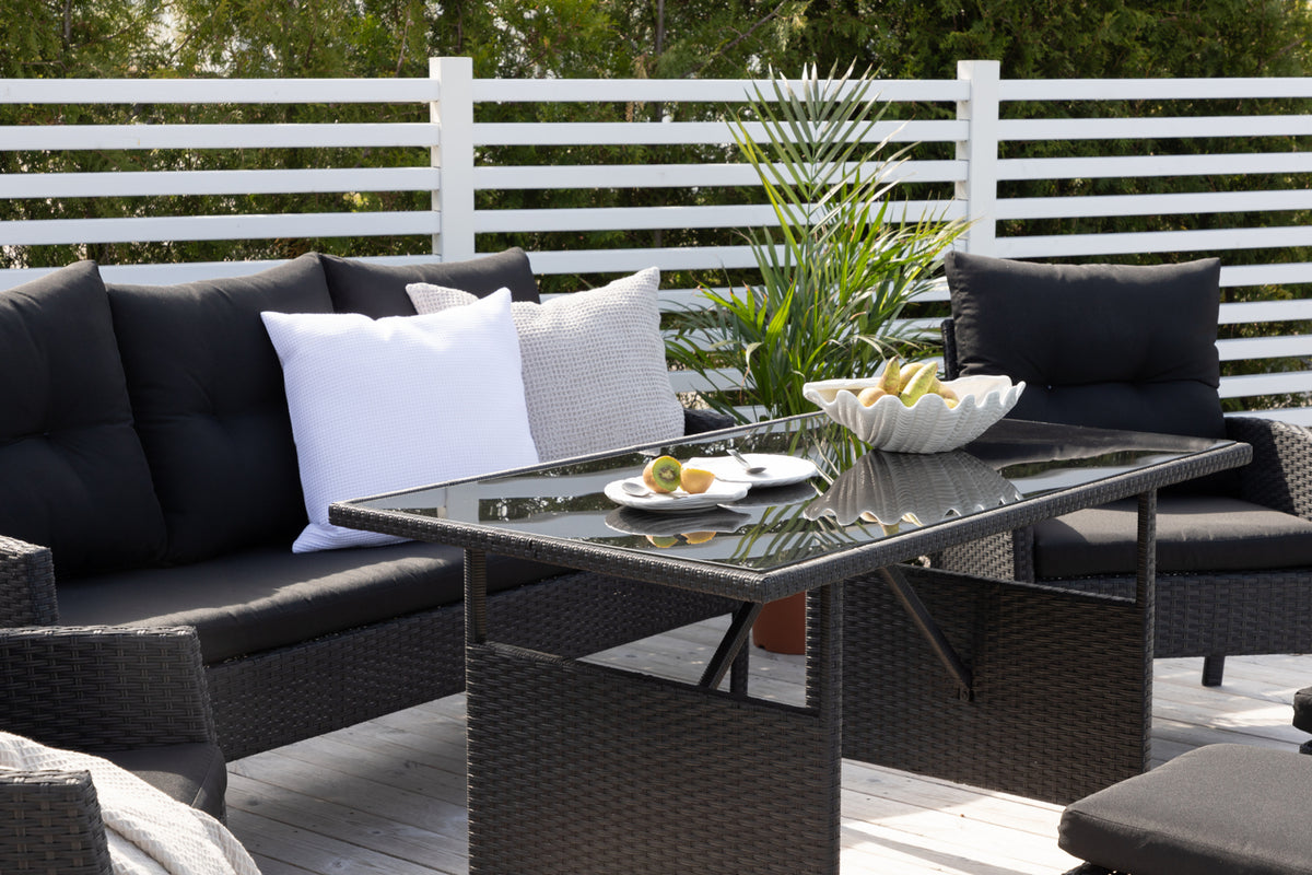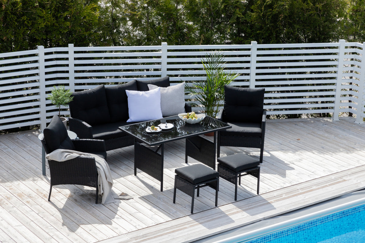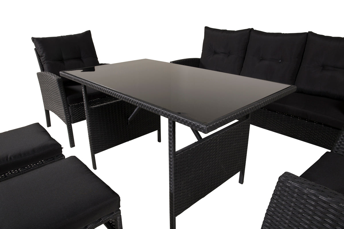 Knock er en moderne, alsidig sofagruppe i sort kunstrattan, der er perfekt til terrassen eller altanen. Sofagruppen består af en trepersoners sofa, to lænestole med armlæn og to skamler, inklusive sorte, quiltede, bløde hynder samt et rektangulært spisebord med en bordplade af sort glas. Lettere montering kræves. Tip: Skamlerne kan bruges som ekstra siddeplads eller som fodskammel til lænestolene eller sofaen.