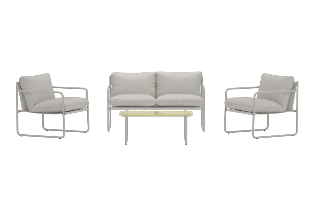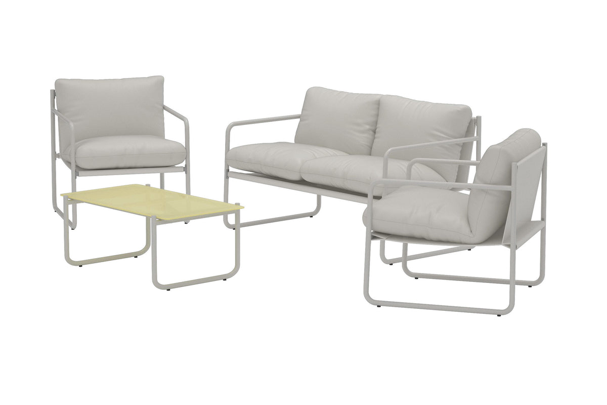 Skab et moderne og behageligt loungemiljø med Thassos sofagruppe i beige. Gruppen består af en rummelig sofa, to lænestole og et stilrent bord, hvilket gør den til en komplet løsning til afslapning og sociale stunder på altanen, terrassen eller i haven.