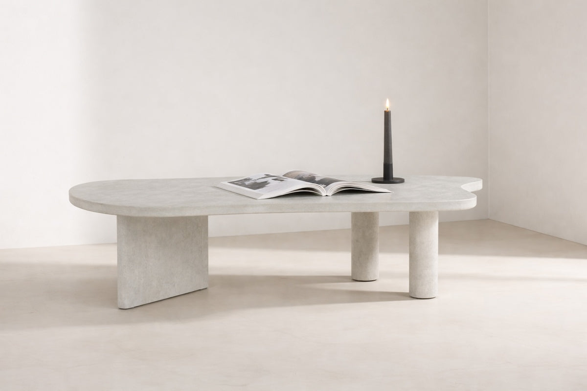 Polle er et sofabord med en spændende form og en stilren overflade i concretelook. Den organiske bordplade giver et moderne og legende udtryk, som passer perfekt i nutidige hjem.