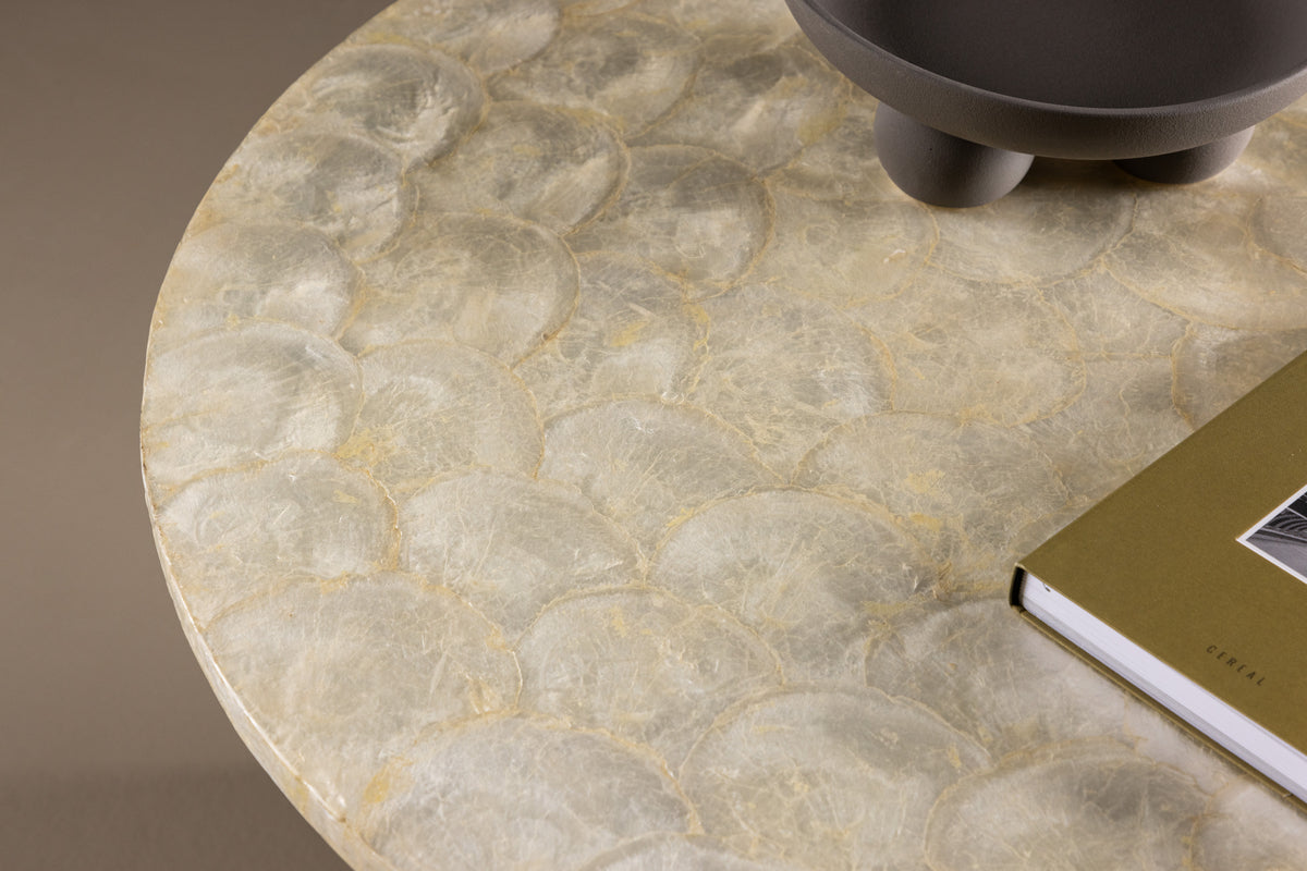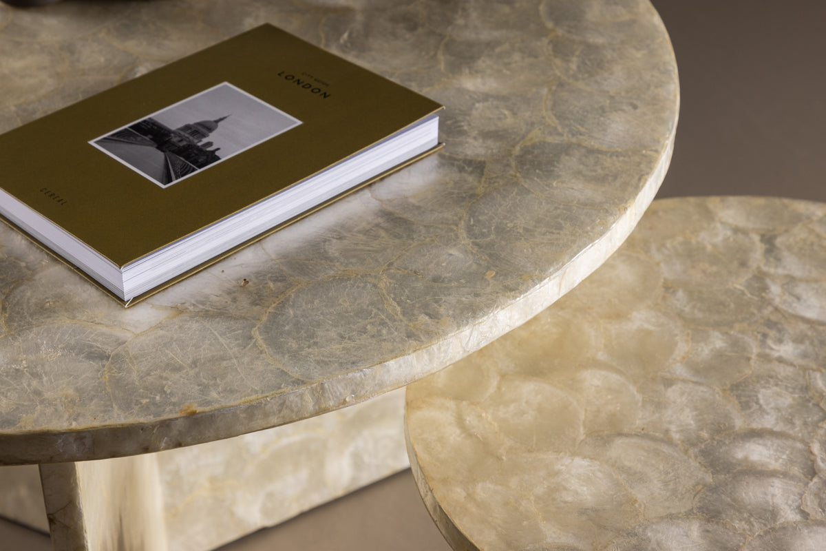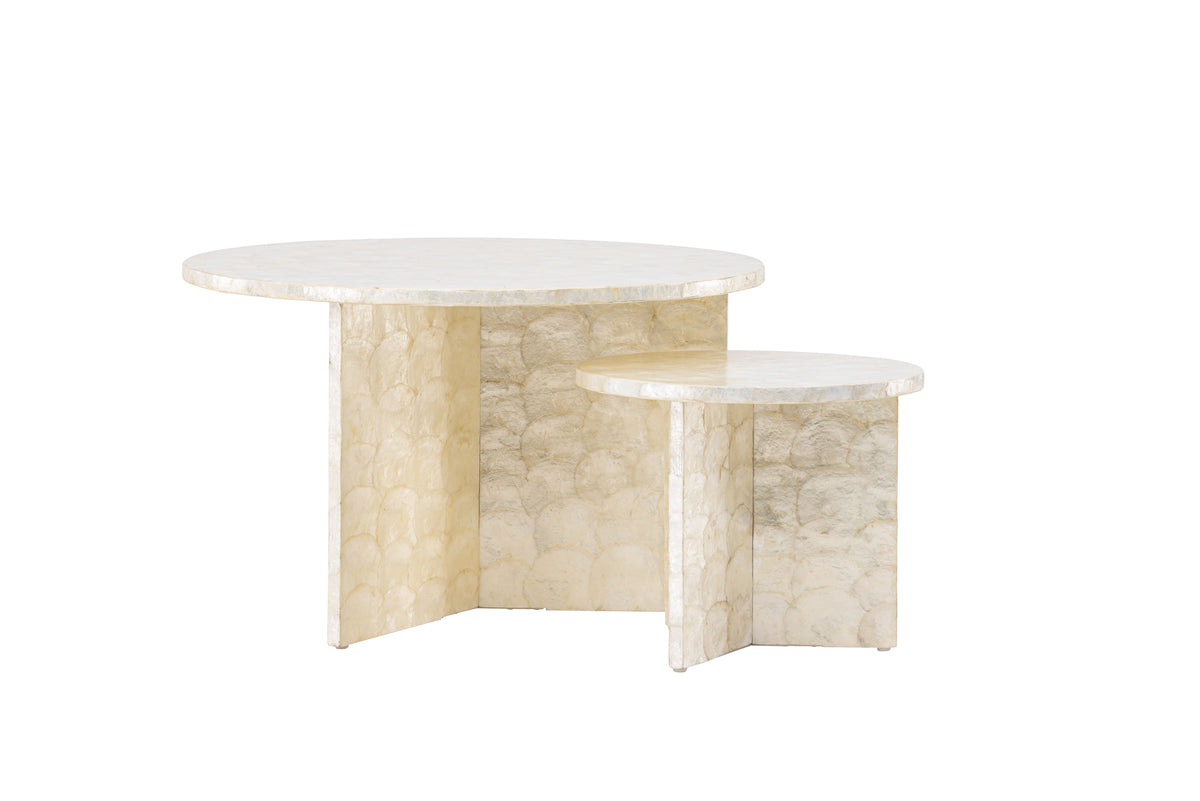 Smögen er et elegant sæt med to stilrene borde fremstillet i det smukke materiale Capiz. De to borde kommer i forskellige størrelser – et større med en diameter på 70 cm og et mindre med en diameter på 40 cm. Perfekte at kombinere sammen, hvor det mindre bord smidigt kan skydes ind delvist under det større for at skabe en fleksibel og dynamisk indretningsløsning. Bordene har en neutral, beige farve, der enkelt smelter ind i forskellige indretningsstile og adderer et naturligt touch til rummet. Smögen-bordene er både funktionelle og smukke, hvilket gør dem til et selvfølgeligt valg for det designbevidste hjem.
