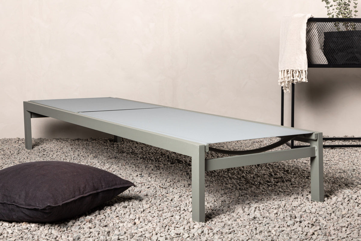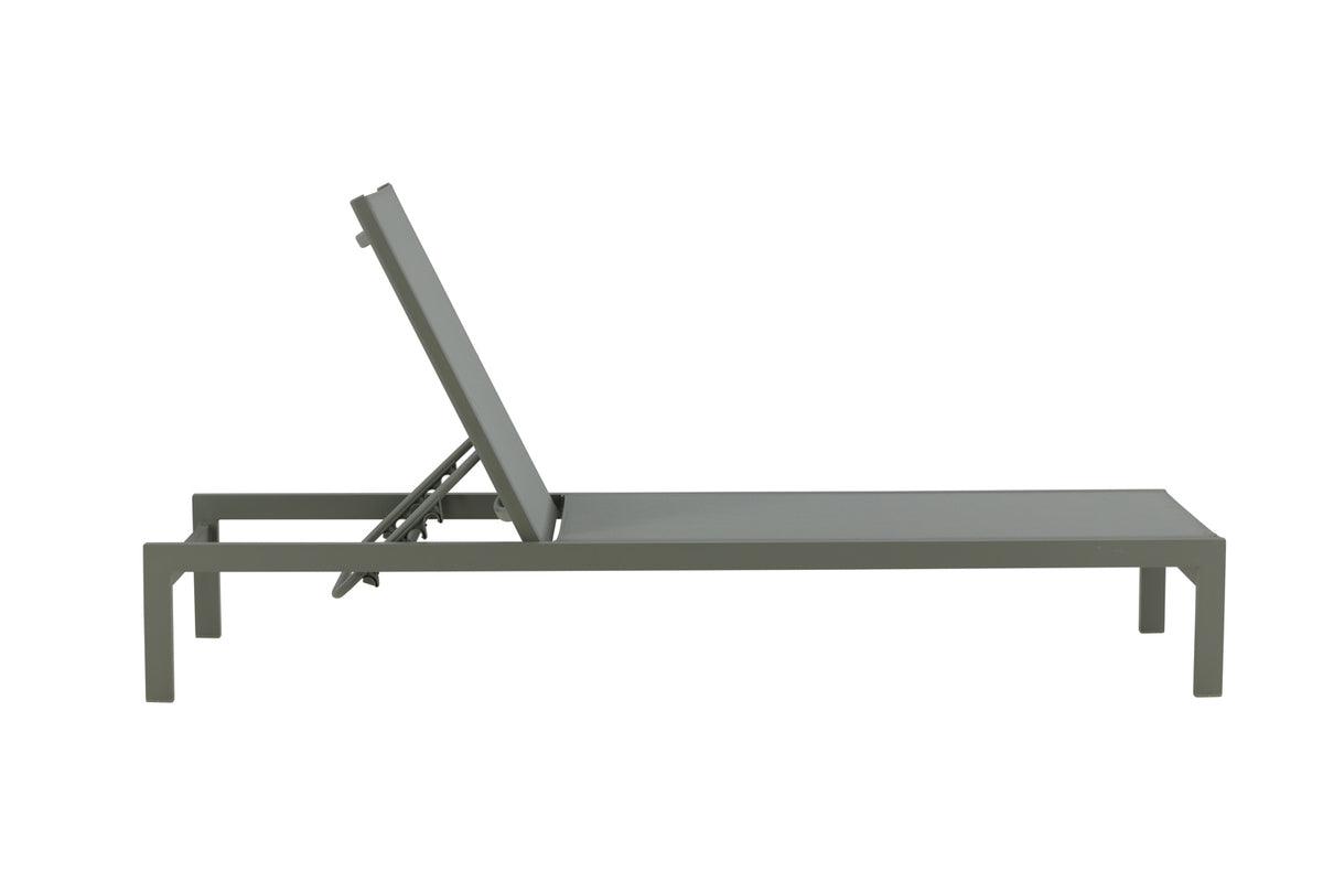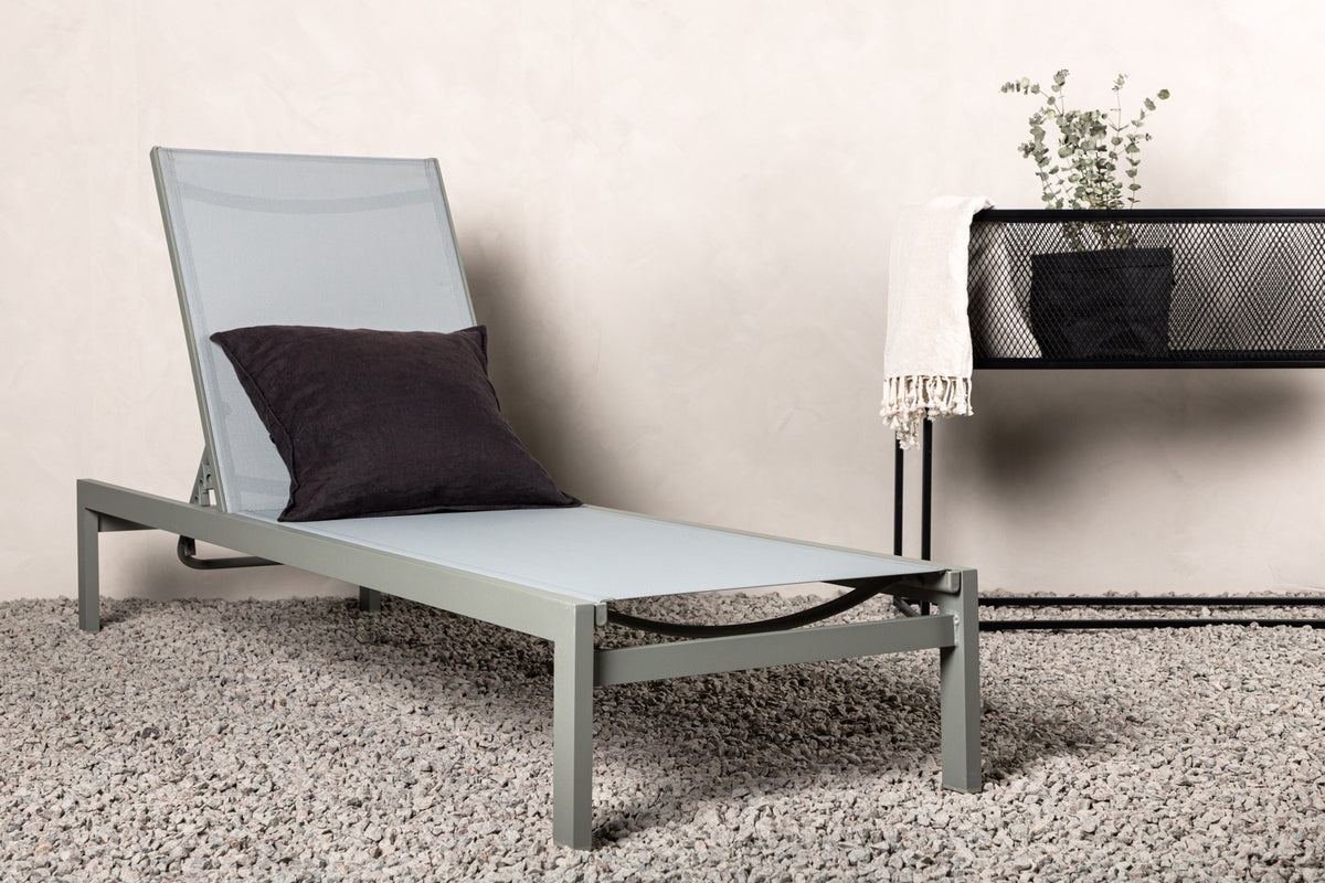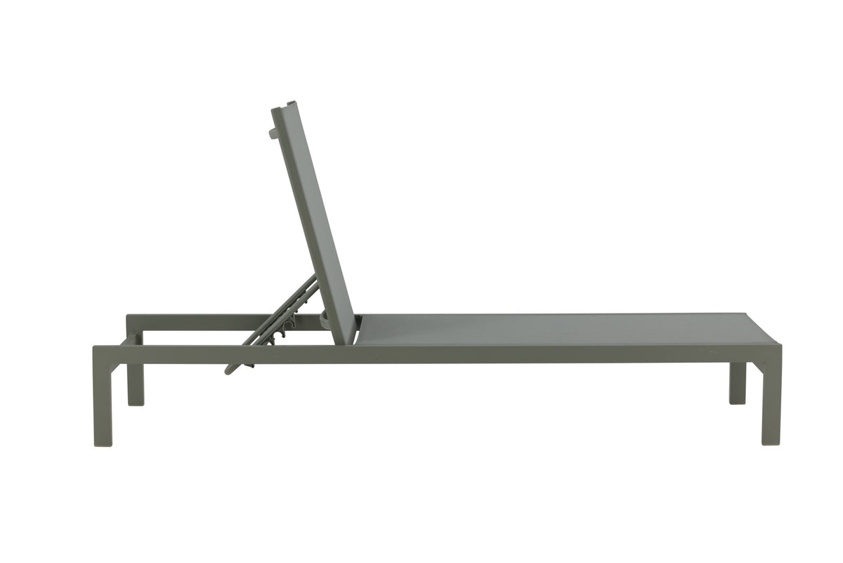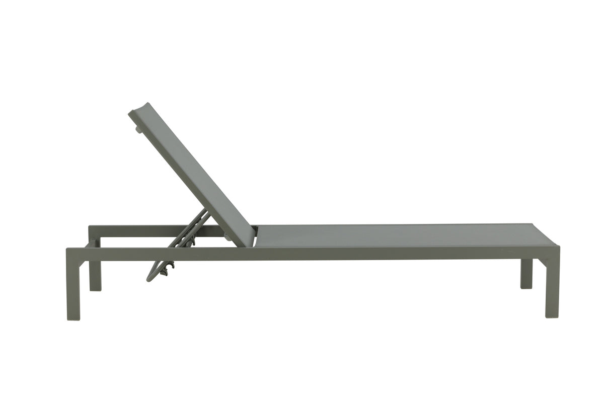 Klassisk solseng i grøn/khakilakeret aluminium. Solsengens ryglæn kan justeres – nyd en skøn lur eller sid behageligt og læs en god bog!