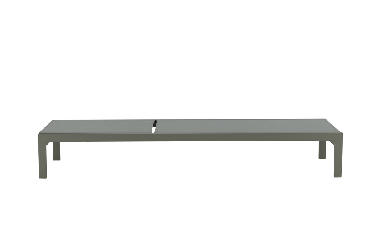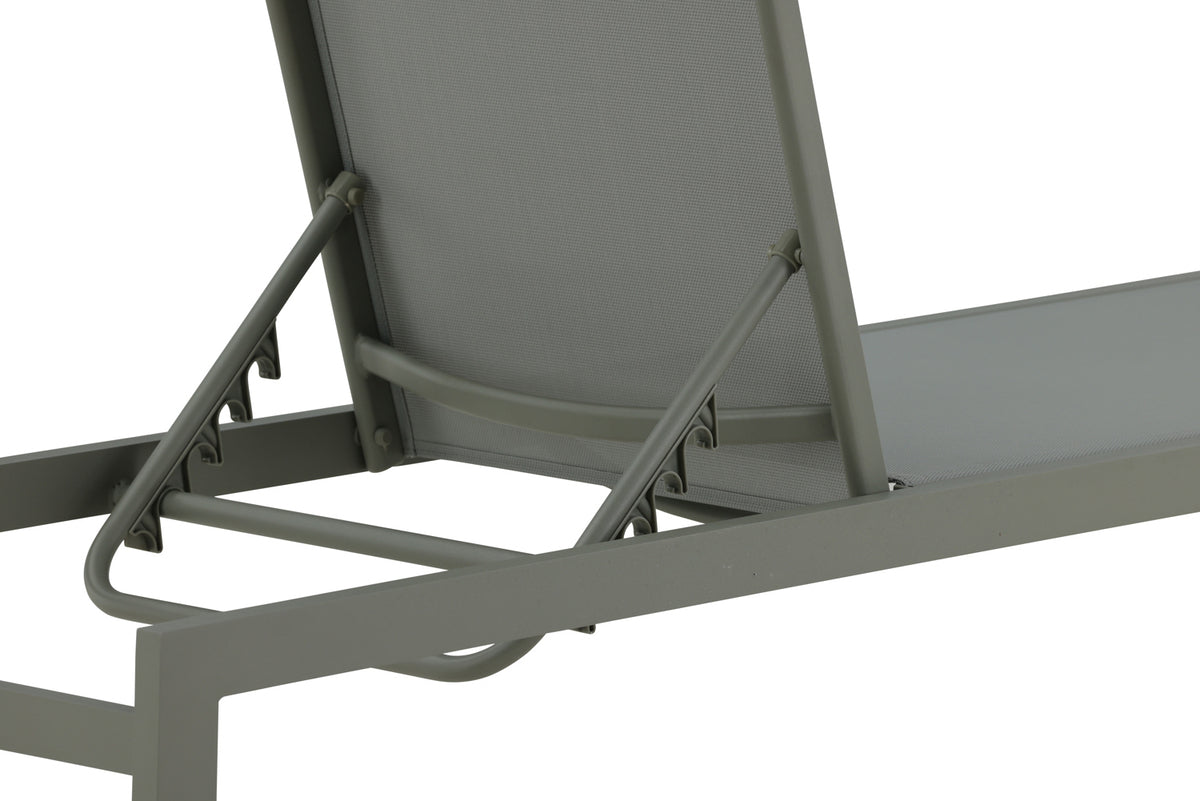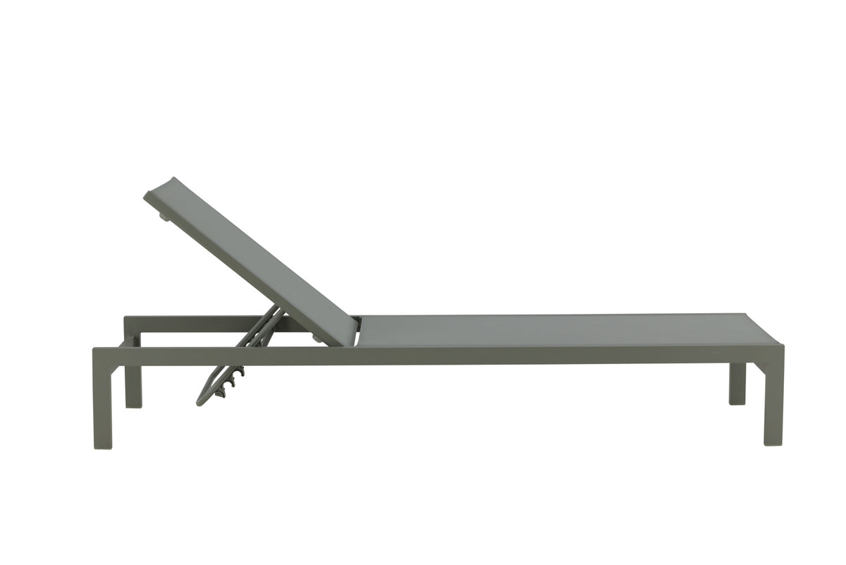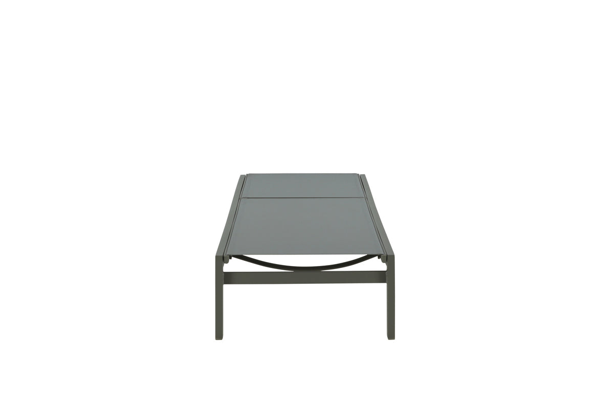 Klassisk solseng i grøn/khakilakeret aluminium. Solsengens ryglæn kan justeres – nyd en skøn lur eller sid behageligt og læs en god bog!