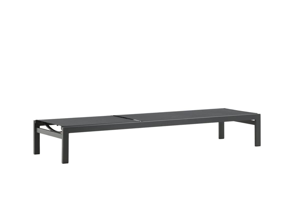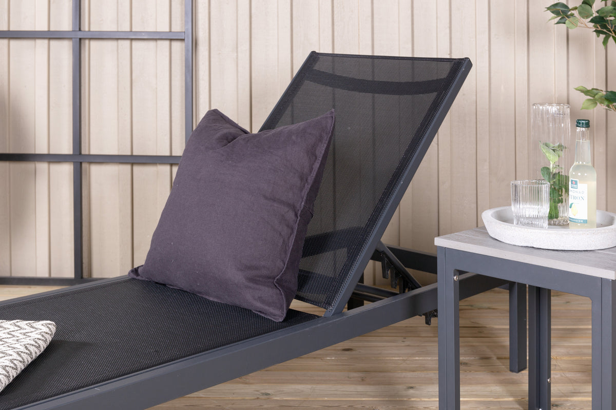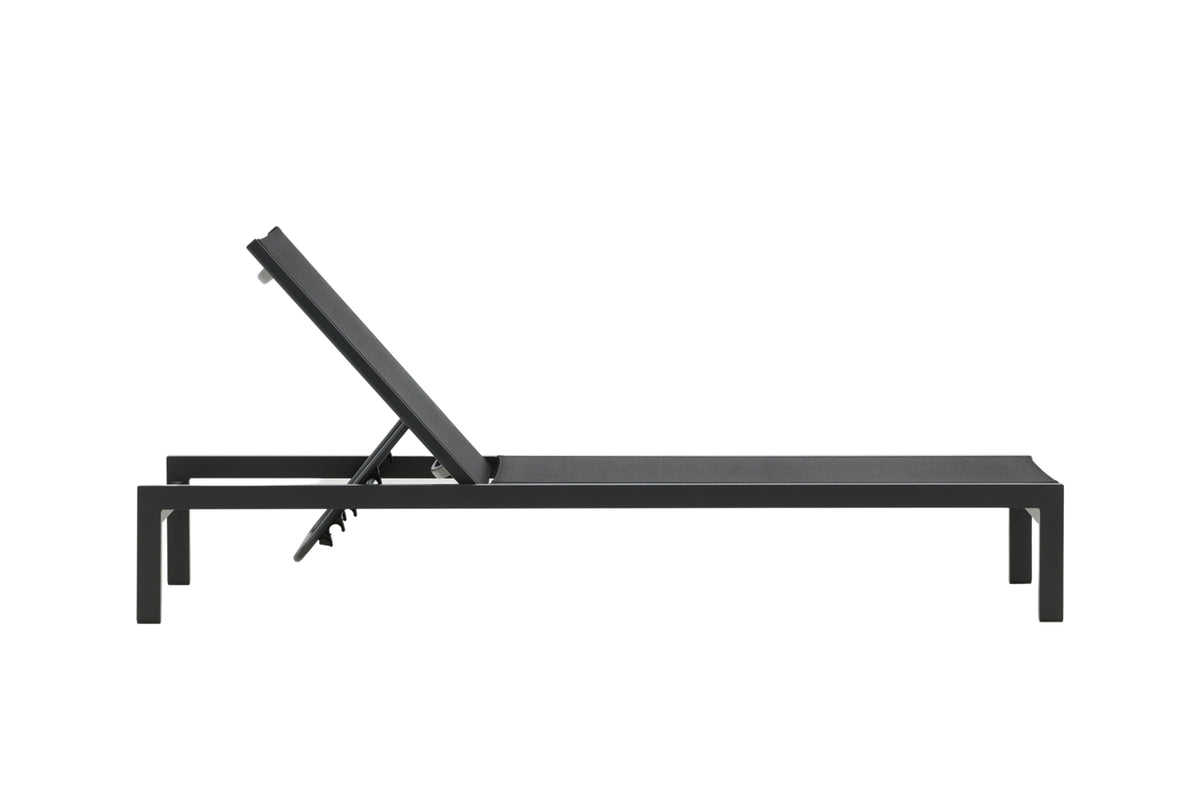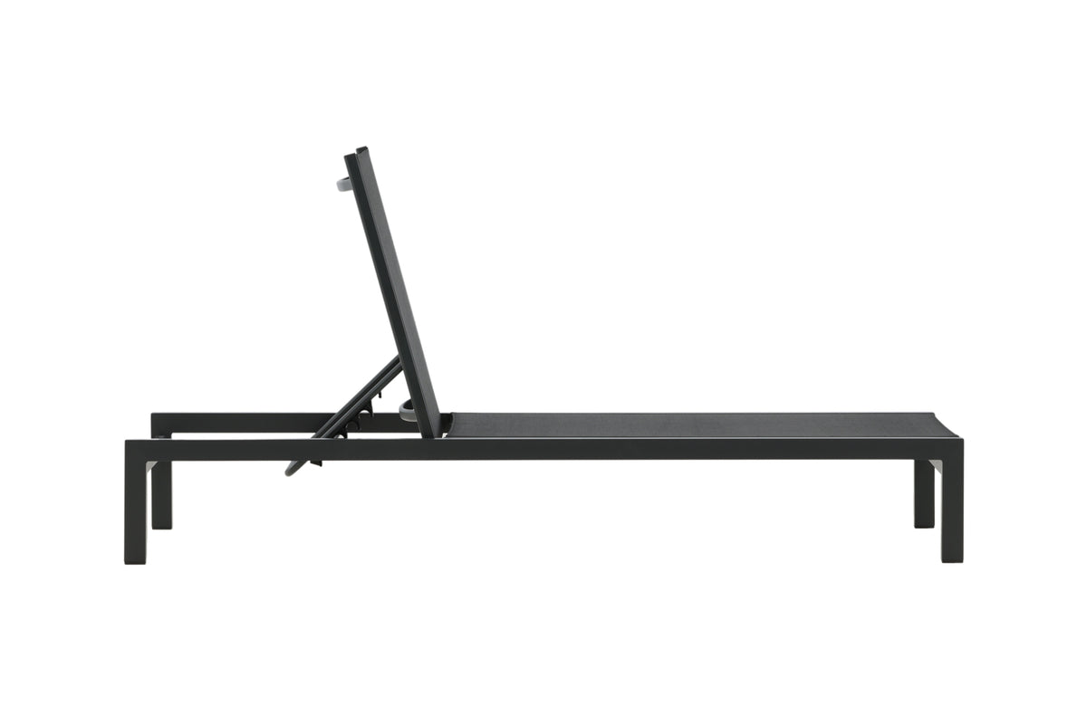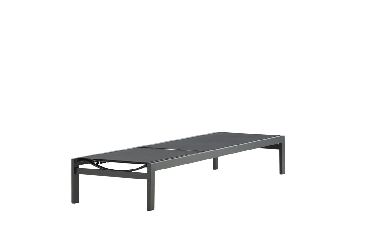 Klassisk solseng i sort aluminium og textilene. Solsengens ryglæn kan justeres – nyd en skøn lur eller sid behageligt og læs en god bog!