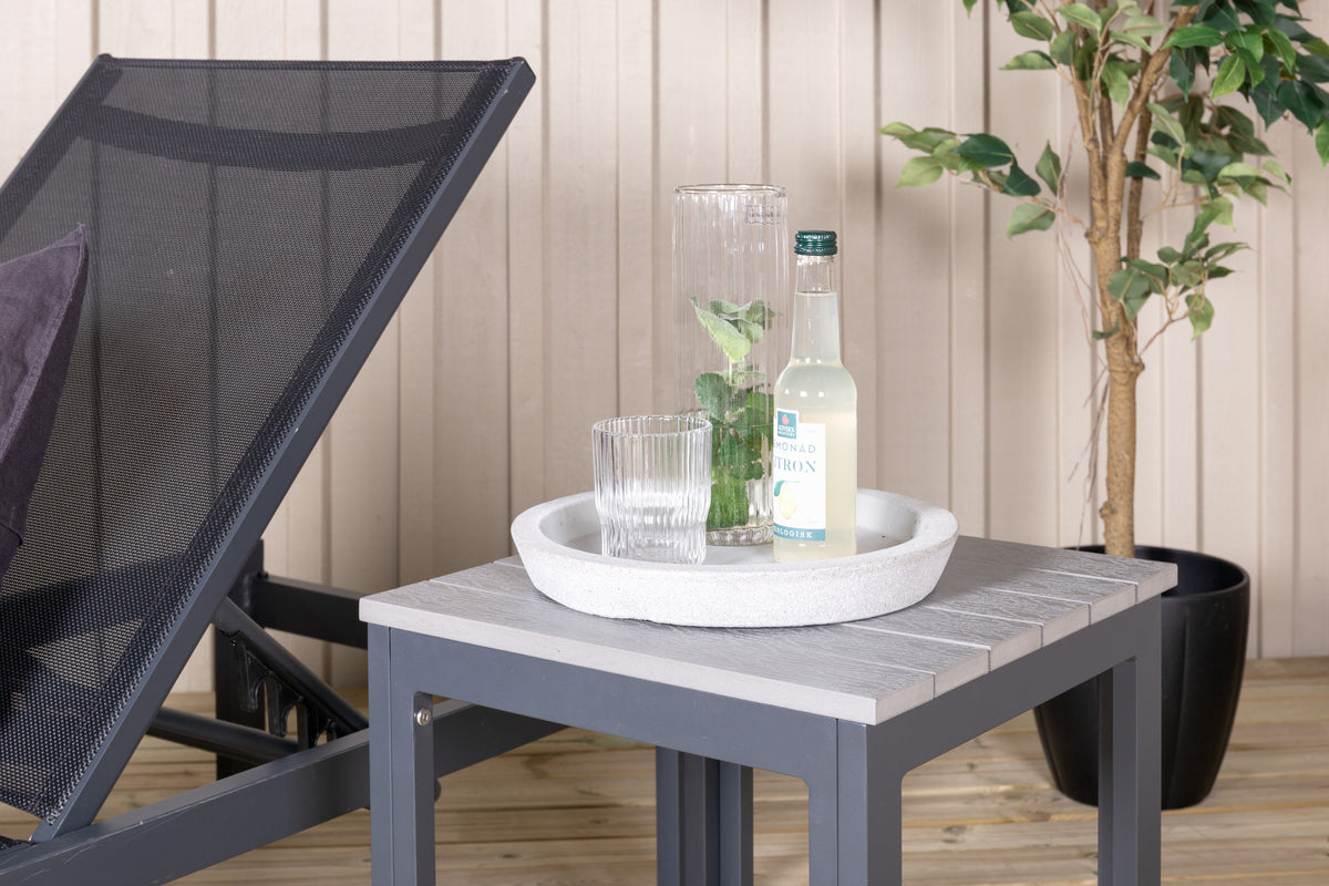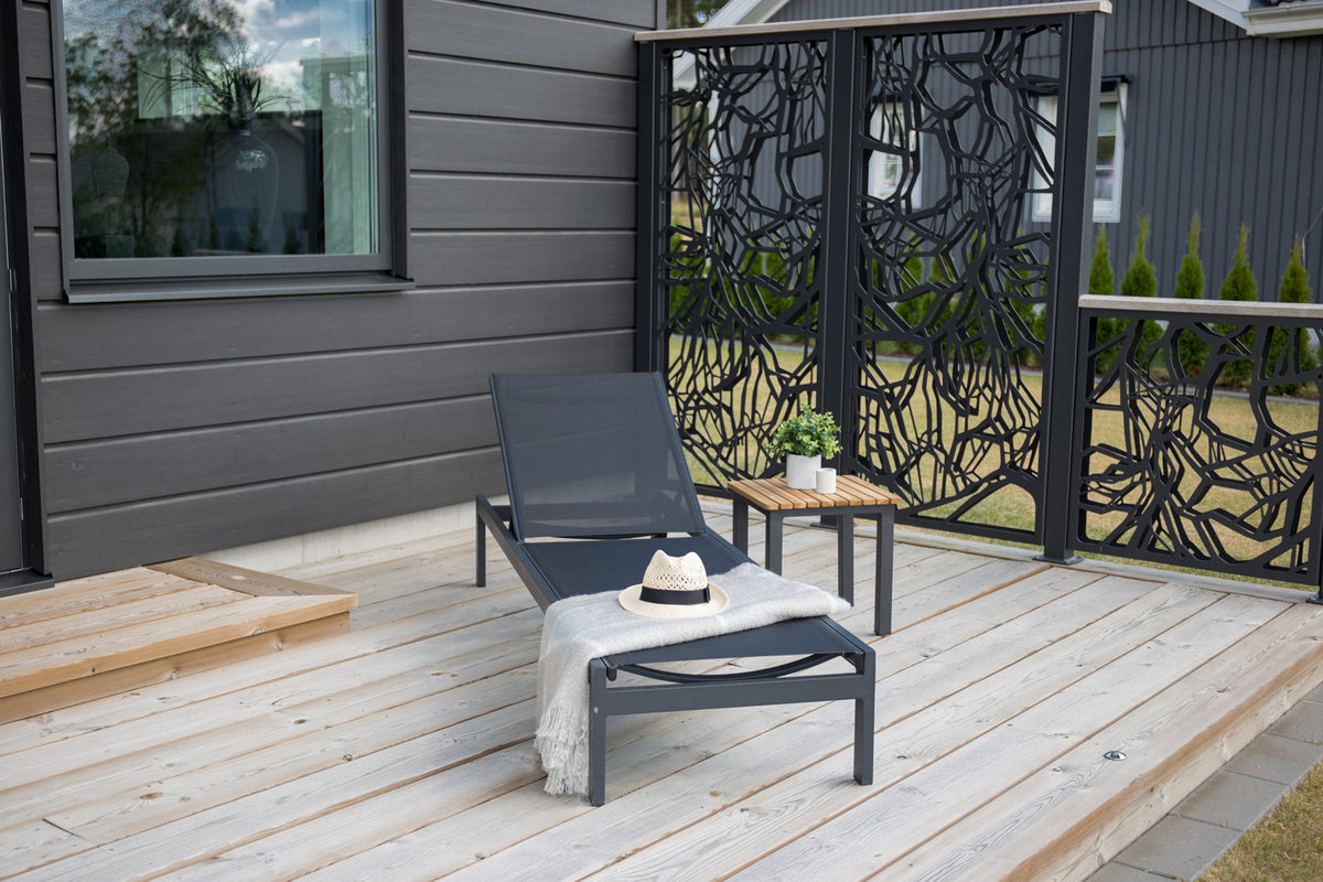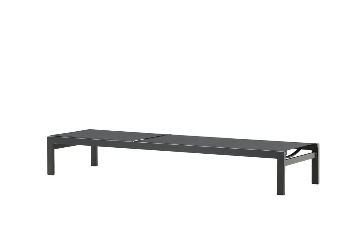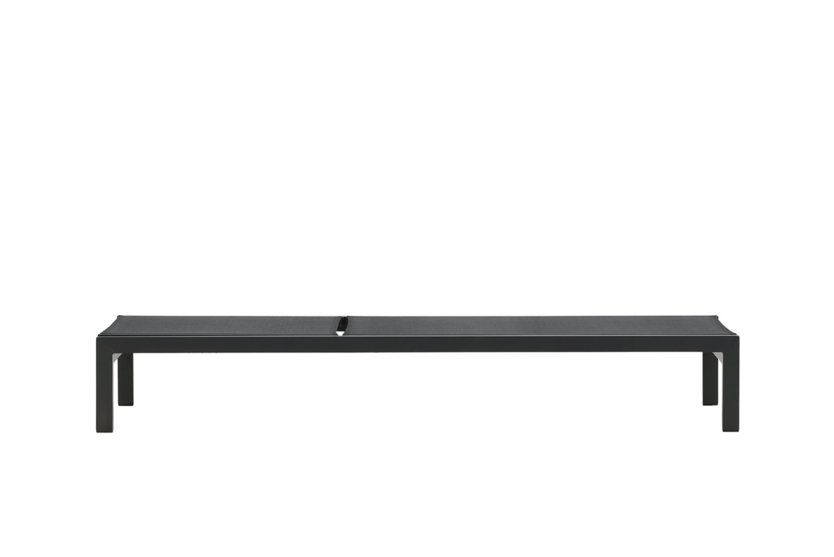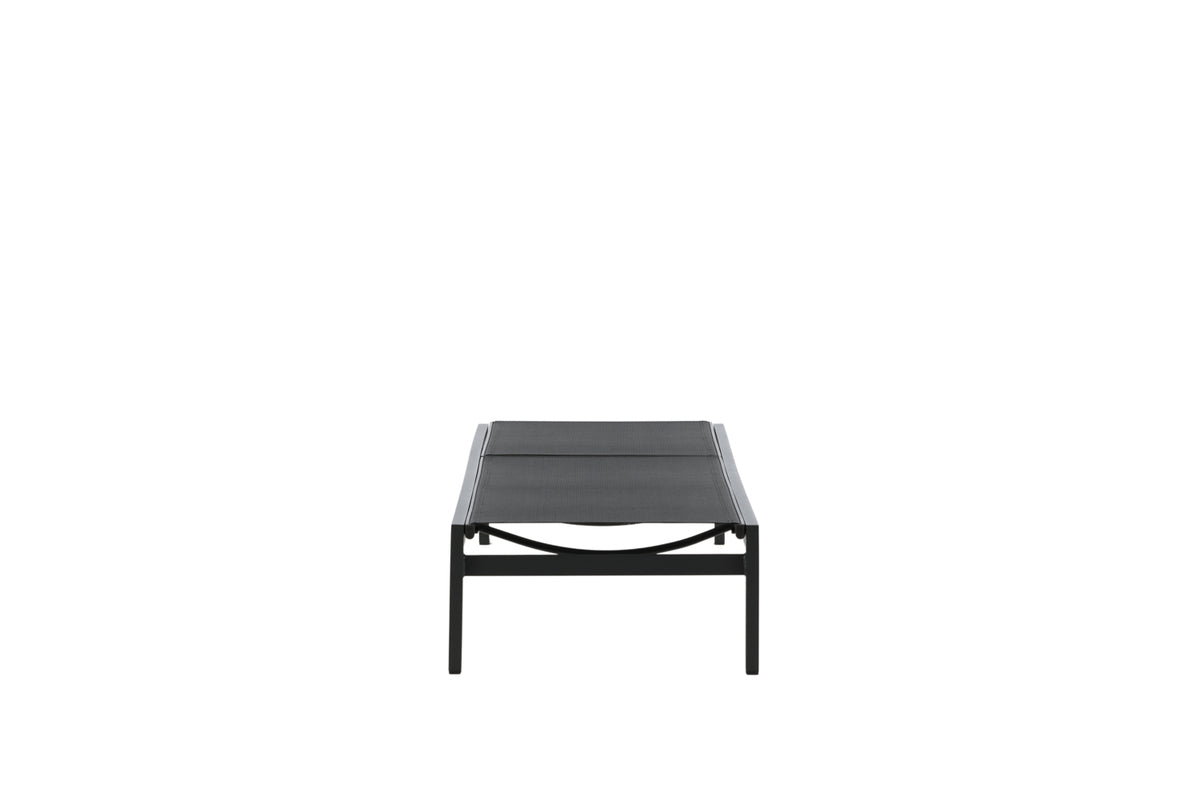 Klassisk solseng i sort aluminium og textilene. Solsengens ryglæn kan justeres – nyd en skøn lur eller sid behageligt og læs en god bog!