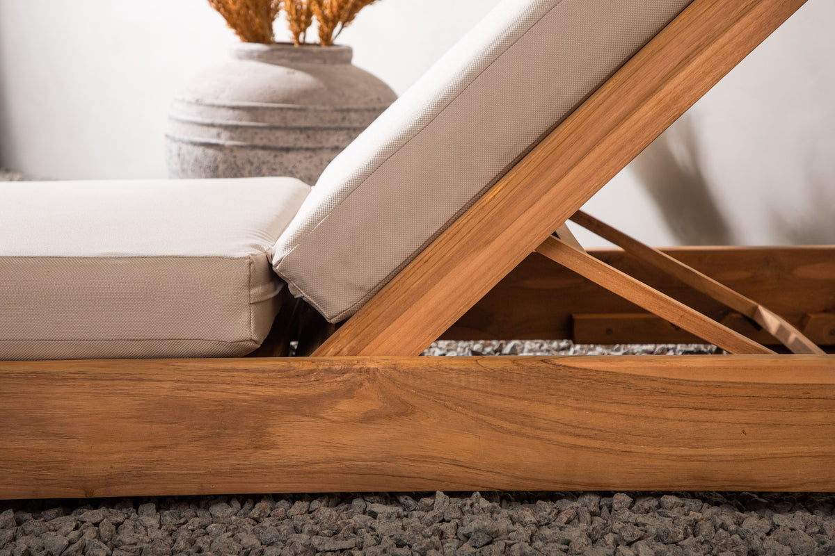 Solsengen fra serien Kenya i teak udgør et tidløst og stilrent design, der passer i mange miljøer. Solsengen har et fældbart ryglæn, der kan justeres i den vinkel, der føles mest behagelig for øjeblikket, og kommer med en beige hynde. Et must for alle dovne dage!