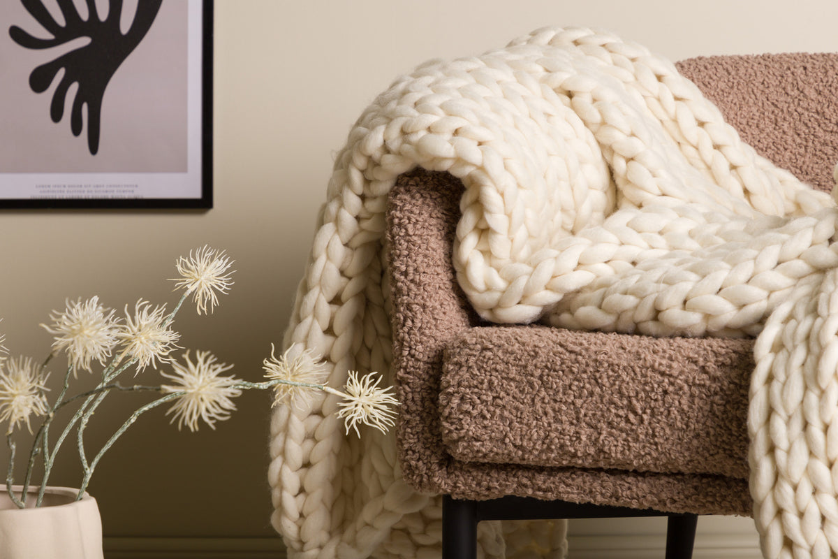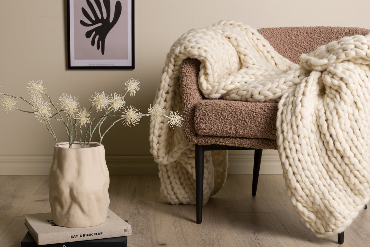 Hyg dig med plaiden Kate! Tænk at krybe op i sofaen med en kop te, den bedste serie på tv og et blødt varmt tæppe over sig. Kate er en strikket plaid med tykt polyestergarn i en cremet beige farve, som holder dig varm, samtidig med at det er en rigtig flot indretningsdetalje i hjemmet. Med sine tykke masker og bløde følelse bliver plaiden Kate hurtigt hele familiens favorit. Smid den på sofaen eller i en lænestol for en rigtig indbydende følelse, det er kun fantasien, der sætter grænser!