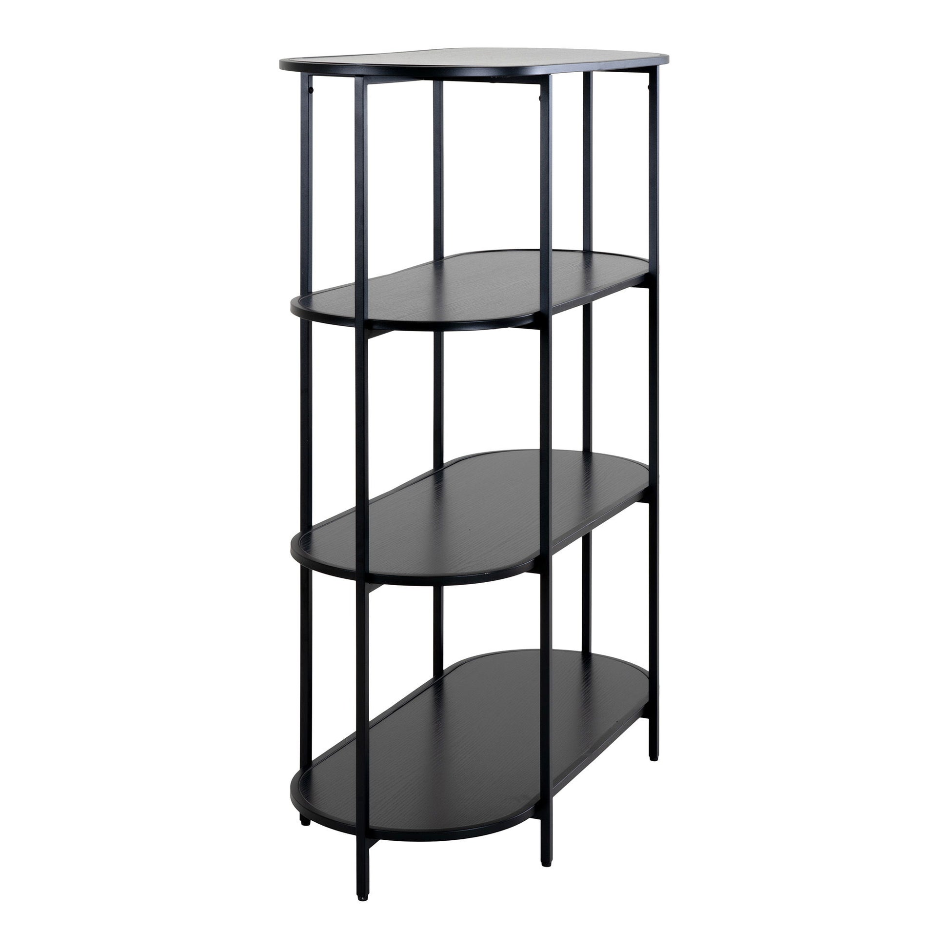 Oval reol, 4 hylder, sort, sort stel\n85x36x111 cm