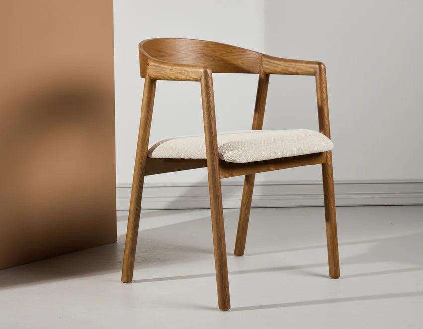 En moderne spisebordsstol i Ask med naturfarvet polstring – kombinerer komfort, skulpturelt design og høj kvalitet.