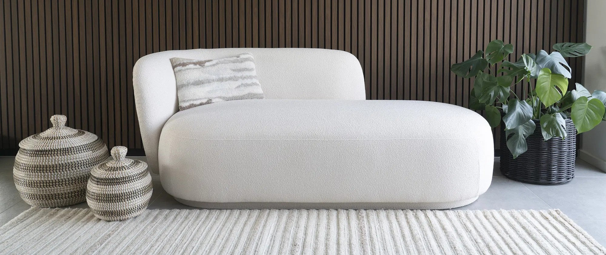 Moderne spisebordsstol i off-white bouclé med drejefod – elegant design og høj komfort.